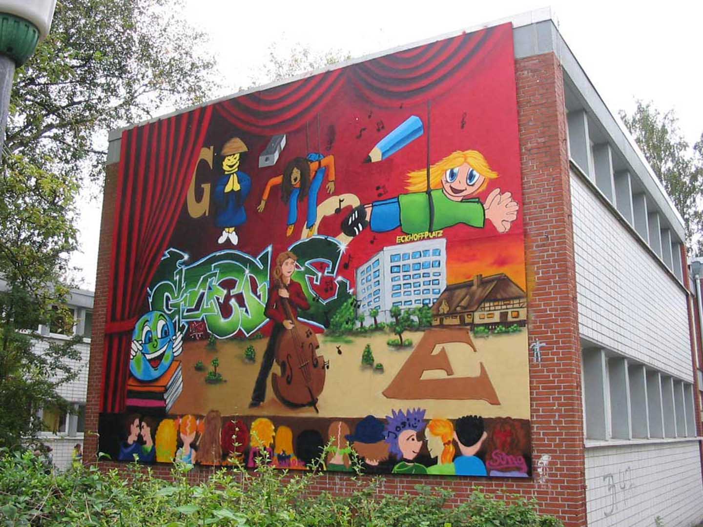 Dem Schulsprecherteam unserer Schule ist es gelungen, beträchtliche Mittel aus dem Luruper Forum für die Verschönerung unserer Schule mit zeitgenössischen Künstlern unter aktiver Mitarbeit unserer SchülerInnen einzuwerben. 2 große Holzplatten an den beiden Stirnseiten von “Haus 1” und “Haus 2” mit einer Gesamtgröße von über 100m² zeigen dann Schule und Stadtteil so, wie sie für unsere SchülerInnen gegenwärtig von Bedeutung sind.