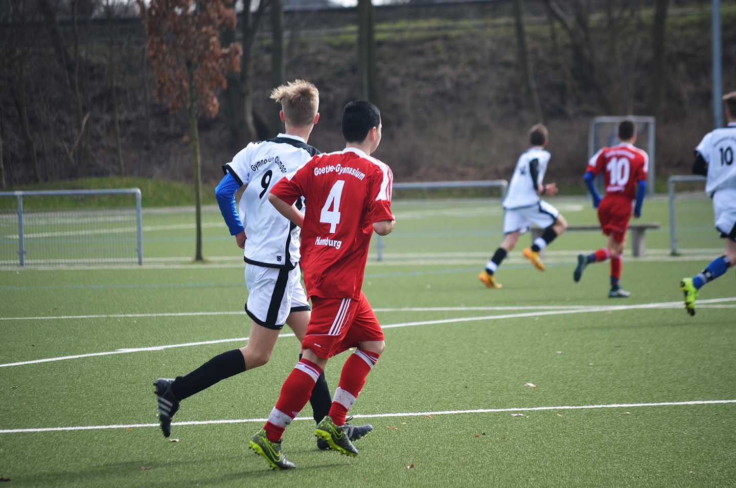Am Dienstag trafen wir auf dem Sportplatz Dockenhuden in Blankenese auf die Gäste aus Niendorf. Schon beim Aufwärmen wirkte der Gegner körperlich fit und fußballtechnisch versiert zu sein. Der Eindruck täuschte nicht und es wurde ein spannendes Spiel auf Augenhöhe. Nach kurzem Abtasten hatten wir in der 7. Minute den besseren Auftakt erwischt, ein langer Pass nach vorne erreichte Cem Yurtsever, welcher den Torwart clever ausspielte und zum 1:0 traf. Knapp zwei Minuten später nutze der Gegner eine Unsicherheit in der Abwehr und eine schöne Kombination, mit passendem Abschluss in den Winkel, bescherte uns das 1:1. In den folgenden Minuten hatten wir einige gute Chancen, konnten aber den Ball nicht im Tor unterbringen. So fand dann ein langer Pass seinen Weg zum gegnerischen Spieler, welcher aus kurzer Distanz ungehindert abziehen konnte und das Gymnasium Ohmoor mit 2:1 in Führung brachte. Die Unsicherheiten in unserer Abwehr veranlasste die beiden Trainer noch vor der Halbzeit zu wechseln und Elvin Pulic ins Spiel zu bringen. Elvin bedanke sich für die Einwechslung kurz vorm Halbzeitpfiff mit einem sehenswerten Distanztreffer zum 2:2. Zur Halbzeit konnte man wirklich nicht sagen, wer diese Partie gewinnen würde. Das Team-Goethe spielte sich zwar immer wieder gute Chancen heraus, aber die Jungs vom Gymnasium Ohmoor spielten die besseren Kombinationen und wirkten im Spielaufbau strukturierter.