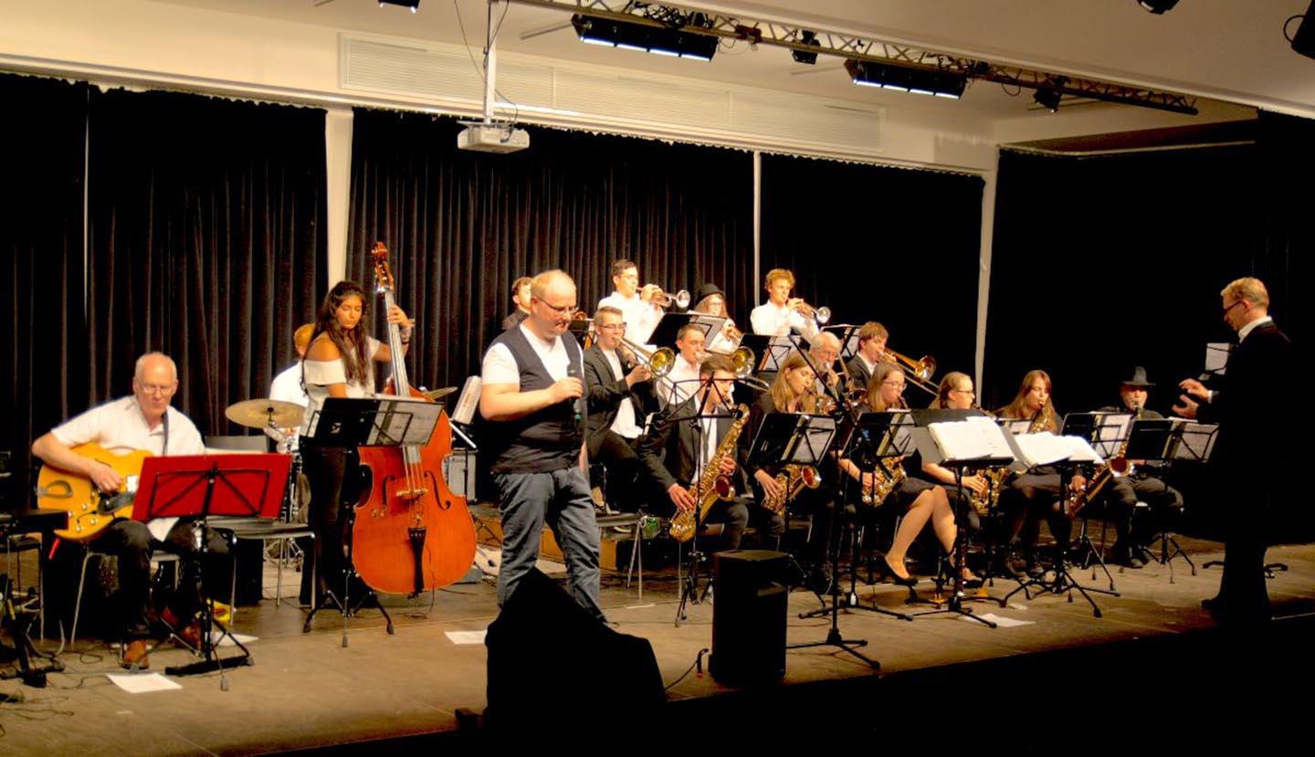 Unter der Leitung von Mathias Junge zeigte die bunt zusammengesetzte Bigband aus Schülern, Lehrern, Eltern und frisch gebackenen Abiturienten ihr ganzes Repertoire vom „James-Bond-Theme“ bis zu „Summertime“ in der bekanntesten Version von Ella Fitzgerald und begeisterte die zahlreichen Swing- und Jazzfreunde.