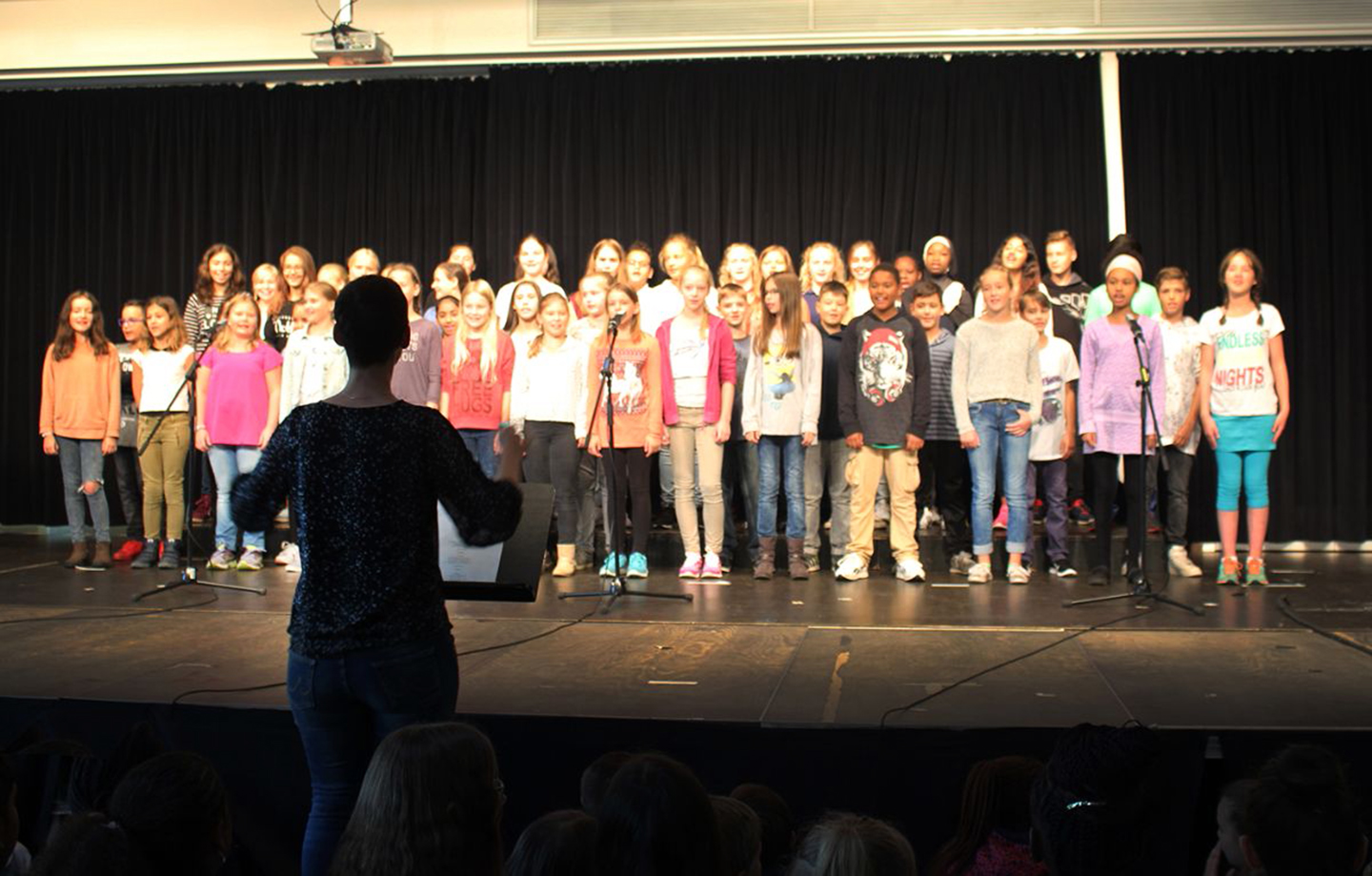Montag, 5. September 2016: Musikalisch wie immer ging es am vergangenen Montag bei der Einschulung der neuen Fünftklässler am Goethe-Gymnasium zu. In der kleinen Feierstunde begrüßte der Unterstufenchor unter der Leitung von Cornelia Barnick die Neulinge. Die „alten Hasen“ aus den Jahrgängen sechs und sieben hatten für ihre Nachfolger das Musikstück „Ein Hoch auf uns“ von Andreas Bourani vorbereitet. In der anschließenden kurzen Rede ließ es sich auch der kommissarische Schulleiter des Goethe-Gymnasiums Karsten Stuhlmacher nicht nehmen, die neuen Fünftklässler willkommen zu heißen. Viele der aufgeregten „Fünfer“ hatten sich Eltern und Freunde als Verstärkung für den Start in den neuen Lebensabschnitt mitgebracht. Die kamen sogar ins Schmunzeln, als sich nach den warmen Willkommensworten des kommissarischen Schulleiters auch der Stufenleiter Klaus Tepp an die Kleinsten der Schule wandte: „’Ein Hoch auf euch’ ist zwar schön, noch schöner wäre – gerade in Hamburg – aber auch ein Hoch über euch.“