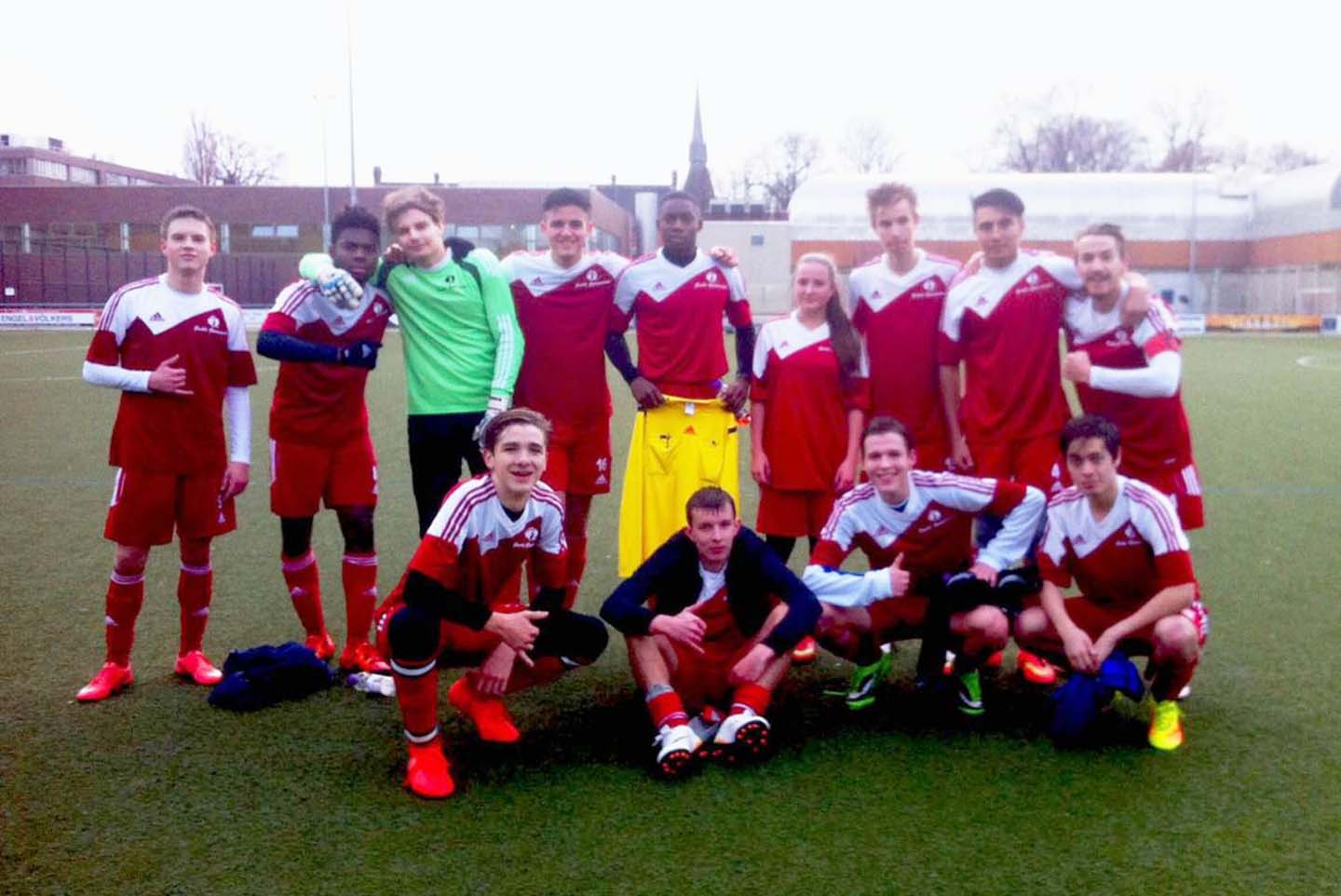 Am Donnerstag, den 01.12.2016 spielte unser Schulteam WK1, Jg. 2001 und älter in der 2. Runde gegen das Gymnasium Kaiser-Friedrich-Ufer. Gegen einen starken Gegner gingen wir schnell durch einen Handelfmeter durch Michel Amorin 1:0 in Führung . Kurz vor der Pause kassierten wir den Ausgleich. Nach dem Wechsel standen wir enorm unter Druck, verteidigten aber vielbeinig und mit Herz, alle warfen sich voll rein. In die Druckphase des Gegners erzielte Michel sein zweites Tor und es taten sich mehr Räume für uns auf.