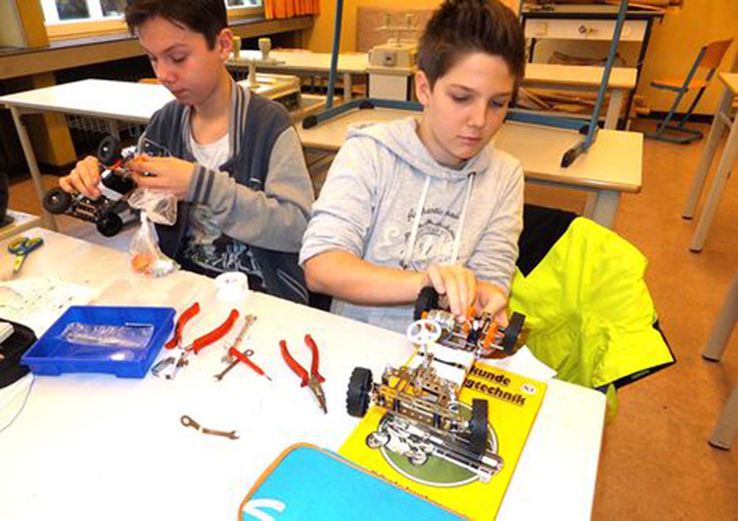 Letztes Mal waren im “Modellbaukurs: Auto” zur Hälfte Mädchen, dieses Mal ist die Lehrerin Frau Aßmann die einzige Frau. Hier seht ihr einige der stolzen Modellbauer, die es schaffen, nach einer Zeichnung ein Automodell zusammen zu schrauben, sodass es sich lenken lässt und mit dem Motor durch die Gegend flitzt. Jetzt stehen wichtige Entscheidungen an: soll mein Modell eine Gangschaltung mit drei Gängen bekommen, oder eine Fernsteuerung für Motor und Lenkung, oder soll es ein Unimog mit Kran werden? Im Januar wollen wir uns Anregungen im Miniaturwunderland holen. Danach wird im Sommer der ein oder andere noch eine Karosserie aus Sperrholz aussägen. Man darf gespannt sein.