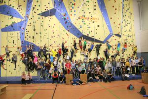 Montag, den 12. November 2018: Annähernd 200 Schülerinnen und Schüler (von ca. 15 verschiedenen Schulen) kamen in der Bugenhagenschule in Hamburg Alsterdorf zusammen, um als Team, bestehend aus vier Schüler_innen, möglichst viele schwere Routen im Toprope zu meistern. Einst der größten Herausforderungen beim Klettern ist es stets, die Schwerkraft zu überwinden, die ja bekanntlich immer wirksam ist.