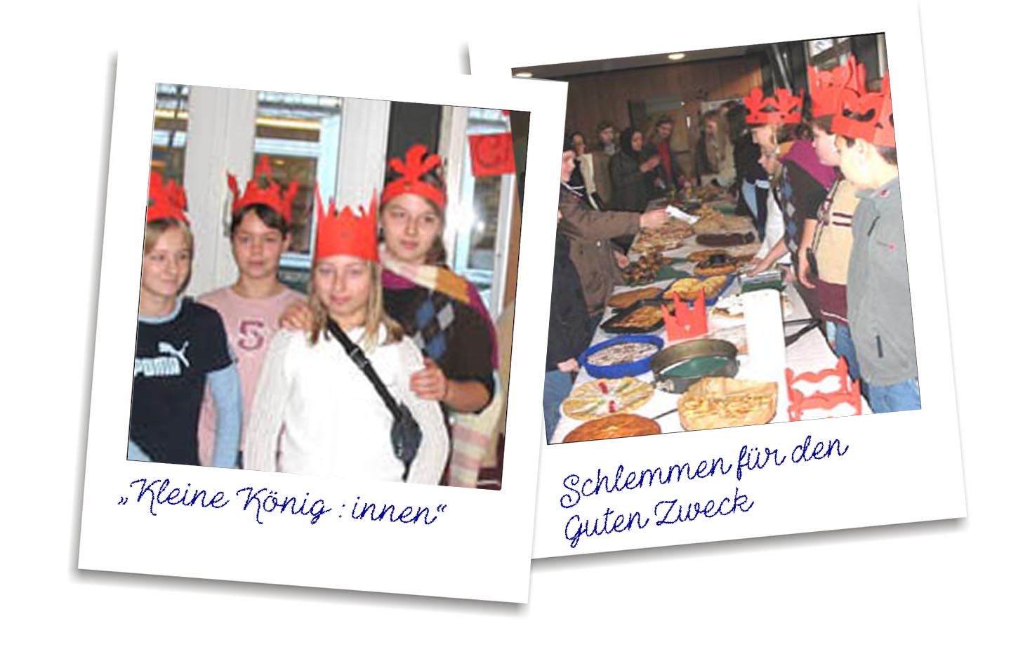 Eigentlich wollten Schülerinnen und Schüler, die am Goethe-Gymnasium ab der 6. Klasse Französisch oder Spanisch lernen, ihren Mitschülern in der Pausenhalle nur zeigen, wie in Frankreich und Spanien das Fest der Heiligen drei Könige begangen wird. Doch dann entschieden sie spontan: Wir nutzen die Aktion, um etwas für die Opfer der Flutkatastrophe in Südostasien zu tun. So backten sie französische Königskuchen, bastelten Königskronen, bereiteten köstliche spanische Tapas zu, bauten Stände und Stellwände mit Informationen über das französische und spanische Dreikönigsfest auf und verkauften ihre Produkte. In zwei großen Pausen drängelten sich Schülermassen vor den Verkaufsständen, aßen und tranken für den guten Zweck, für den aus dem Verkaufserlös und einigen zusätzlichen Spenden von den Schülern sage und schreibe eine Summe von etwas über 1000 € zusammenkam, die nun an eine Hilfsorganisation überwiesen werden kann.