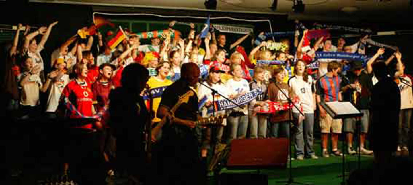 Aus gegebenem Anlass haben die Musiker unter den Goethe-Gymnasiasten diesmal ein Sujet ausgewählt, das der Fußball-Weltmeisterschaft Rechnung trägt, die in den nächsten Wochen in unserem Lande, in unserer Stadt und auch im Stadion in unserer Nachbarschaft stattfinden wird. „Der Schall ist rund“ haben sie ihre Aufführung genannt und ihr den Untertitel „Abseitsmelodien“ gegeben. Unter der musikalischen Leitung von Astrid Demattia und der bewährten Regie von Christoph Gottschalch waren sie auch in diesem Jahr wieder mit von der Partie: Der Große Chor, der Kammerchor und die Band – mehr als 60 Akteure, die sich auf der Bühne in der Pausenhalle der Schule drängten und sich auf eine sympathische, nicht immer ganz ernst gemeinten Weise dem Fußball und der von ihm ausgehenden Faszination näherten.