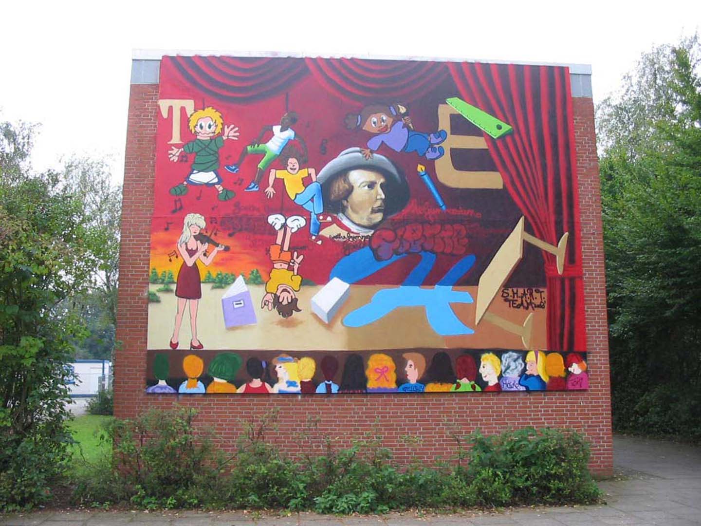 Dem Schulsprecherteam unserer Schule ist es gelungen, beträchtliche Mittel aus dem Luruper Forum für die Verschönerung unserer Schule mit zeitgenössischen Künstlern unter aktiver Mitarbeit unserer SchülerInnen einzuwerben. 2 große Holzplatten an den beiden Stirnseiten von “Haus 1” und “Haus 2” mit einer Gesamtgröße von über 100m² zeigen dann Schule und Stadtteil so, wie sie für unsere SchülerInnen gegenwärtig von Bedeutung sind.