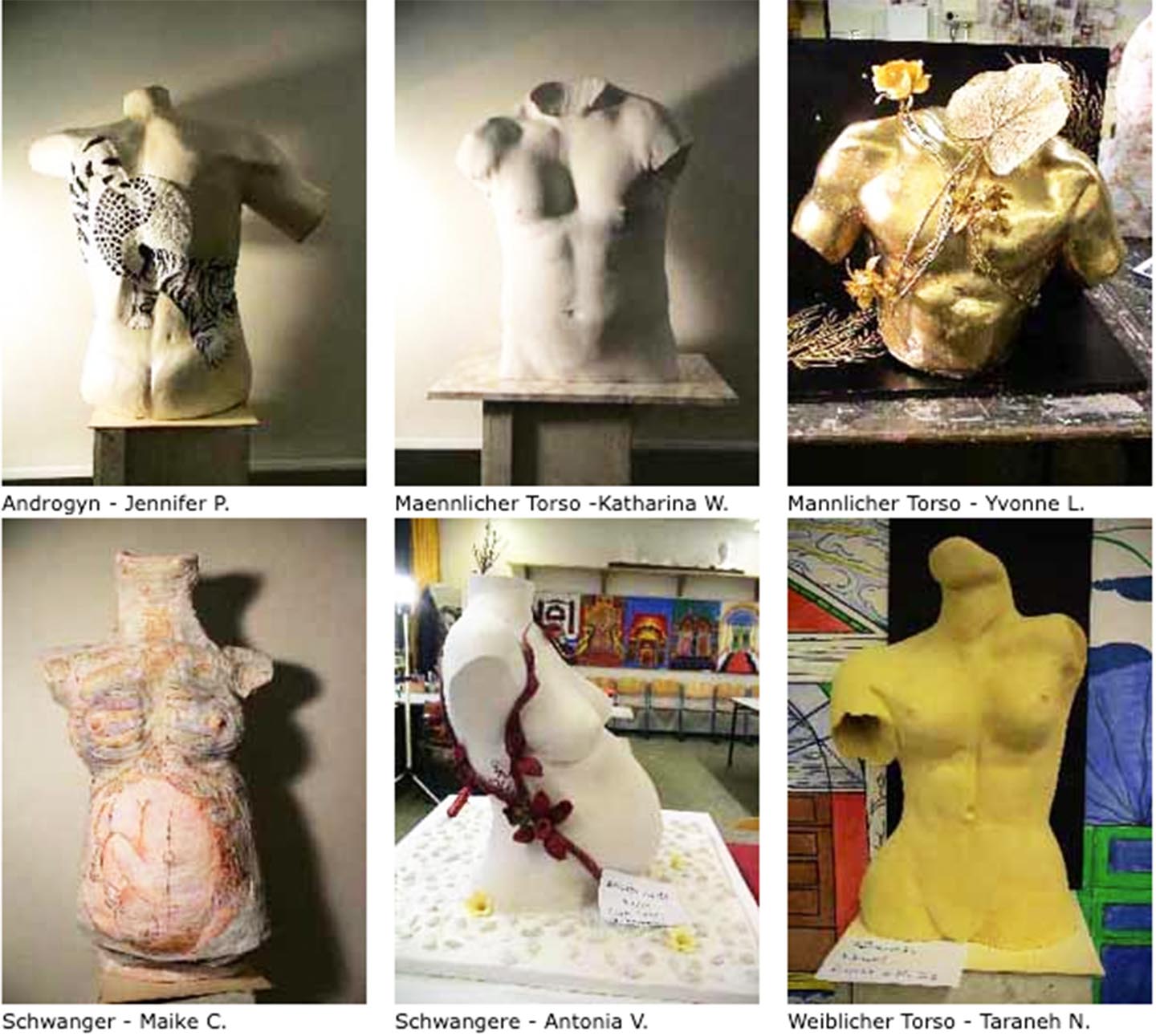 Plastische Arbeiten zum Thema “Torso”, die entweder durch Abformen menschlicher Körper, Aufbau mit Draht- und Pappmaché oder durch keramische Aufbautechnik hergestellt wurden. Ziel dabei war, ein persönliches Thema wie “Androgynität, Schwangerschaft, Ent- und Verhüllung oder ideale männlich oder weibliche Schönheit” darzustellen. Außer der plastischen Arbeit spielt dabei auch die Oberflächengestaltung durch Glätten, Bemalen und Dekorieren eine große Rolle. Die Arbeiten sind mit großem persönlichen Einsatz ausgeführt worden, der sich gelohnt hat, aber in etlichen Haushalten wohl Ärger durch den angefallenen Werkstaub verursacht hat.