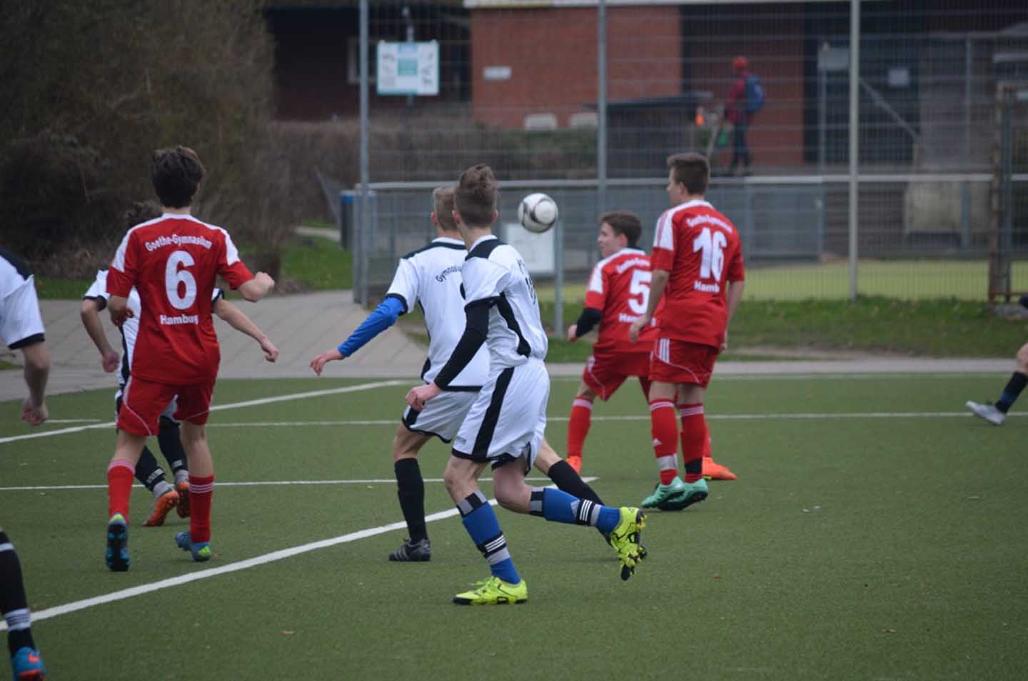 Am Dienstag trafen wir auf dem Sportplatz Dockenhuden in Blankenese auf die Gäste aus Niendorf. Schon beim Aufwärmen wirkte der Gegner körperlich fit und fußballtechnisch versiert zu sein. Der Eindruck täuschte nicht und es wurde ein spannendes Spiel auf Augenhöhe. Nach kurzem Abtasten hatten wir in der 7. Minute den besseren Auftakt erwischt, ein langer Pass nach vorne erreichte Cem Yurtsever, welcher den Torwart clever ausspielte und zum 1:0 traf. Knapp zwei Minuten später nutze der Gegner eine Unsicherheit in der Abwehr und eine schöne Kombination, mit passendem Abschluss in den Winkel, bescherte uns das 1:1. In den folgenden Minuten hatten wir einige gute Chancen, konnten aber den Ball nicht im Tor unterbringen. So fand dann ein langer Pass seinen Weg zum gegnerischen Spieler, welcher aus kurzer Distanz ungehindert abziehen konnte und das Gymnasium Ohmoor mit 2:1 in Führung brachte. Die Unsicherheiten in unserer Abwehr veranlasste die beiden Trainer noch vor der Halbzeit zu wechseln und Elvin Pulic ins Spiel zu bringen. Elvin bedanke sich für die Einwechslung kurz vorm Halbzeitpfiff mit einem sehenswerten Distanztreffer zum 2:2. Zur Halbzeit konnte man wirklich nicht sagen, wer diese Partie gewinnen würde. Das Team-Goethe spielte sich zwar immer wieder gute Chancen heraus, aber die Jungs vom Gymnasium Ohmoor spielten die besseren Kombinationen und wirkten im Spielaufbau strukturierter.