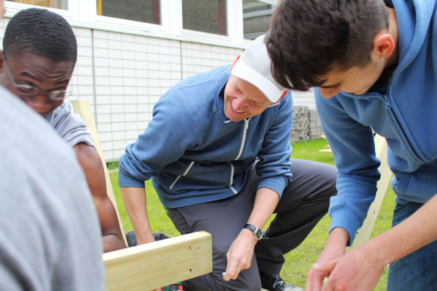 Donnerstag, 30. Juni 2016: Nicht nur das Kollegium staunte, dass der sonst immer so korrekt im Anzug gekleidete Verbindungslehrer Herr Kindler heute ganz lässig mit Baseballkappe und Hoodie in die Schule kam – das Rätsel löste sich auf, auf sich das Schulsprecherteam, Frau Jäger und auch voll integriert unsere ZEA-KollegInnen und Schüler im Innenhof ans Werk machten. Die ersten Tische des grünen Klassenzimmers sind hier tatkräftigst geschreinert worden!