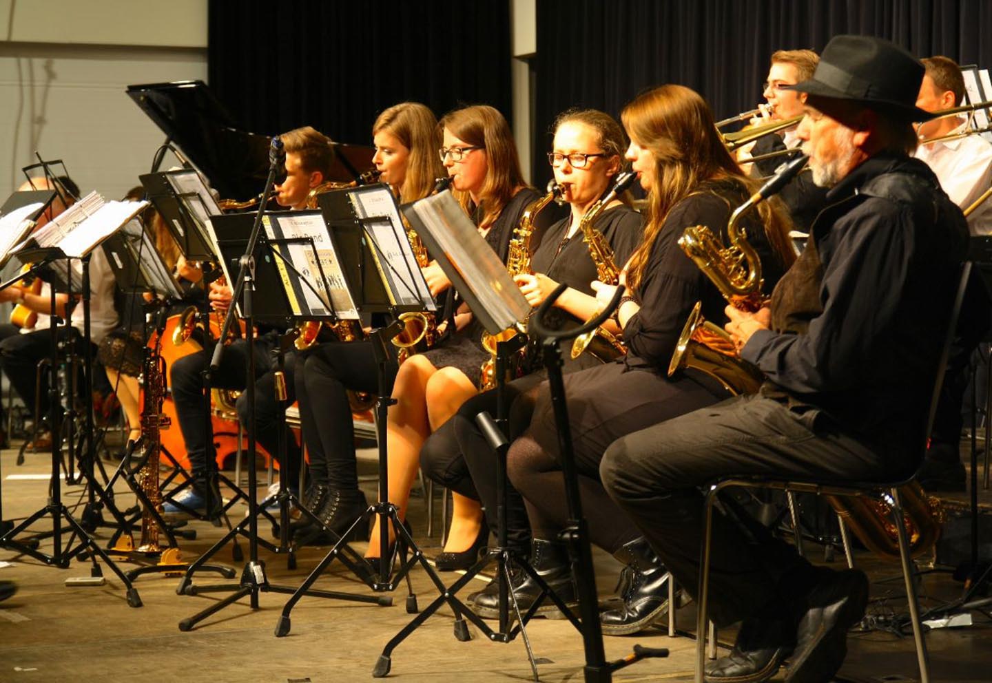 Immer wieder streuten die Musiker gekonnt und selbstbewusst ihre solistischen Fähigkeiten ein – angefangen mit gefühlvollen Saxofonelementen bis hin zu fulminanten Trompetenparts und Bassspuren. So kamen die Gäste in den Genuss zahlreicher, musikalisch sehr gut ausgebildeter Nachwuchsmusiker.