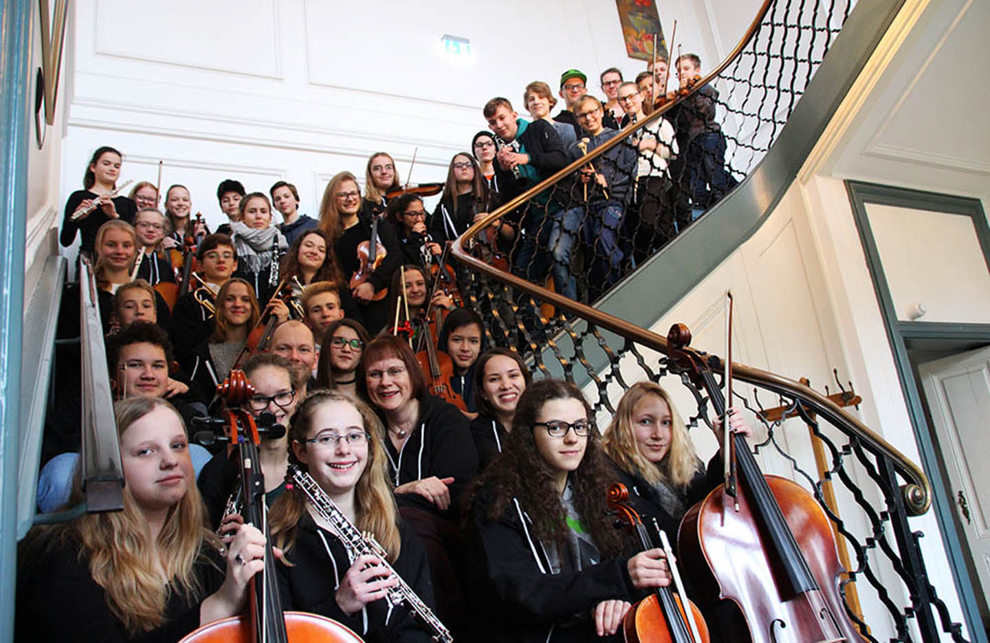 Montag, 16. Januar 2017: Diese Reise begann damit, dass wir darauf warteten, dass die vereisten Gepäckklappen aufgehen würden. Da der Busfahrer nicht mitbekommen hatte, dass wir ein Orchester sind, lautete die Ansage: „Alle Instrumente neben euch in den Bus!“ Das bereitete spätestens beim Cello ein ernst zu nehmendes Problem. Denn egal wie rum und wo – es passte hinten und vorne nicht. So war der Bus auf der gesamten Fahrt in zwei Hälften geteilt, da die Hälse verschiedener Celli in den Gang ragten. Außerdem entstanden diverse Gerüchte, wer wohl als erstes von einem durch die Gegend fliegenden Cello touchiert werden würde. Sie wurden auch in die später beschriebene Kreativaufgabe eingebaut. Als wir dann endlich auf Schloss Noer ankamen und die Zimmer bezogen hatten, gab es erstmal das für seine Qualität bekannte Mittagessen in einem der historischen Säle des Schlosses. Danach fingen wir an, unsere verschiedenen Stücke für die unterschiedlichen Besetzungen zu proben, was einige Schwierigkeiten mit sich brachte, da wir die meisten Noten quasi zum ersten Mal sahen.