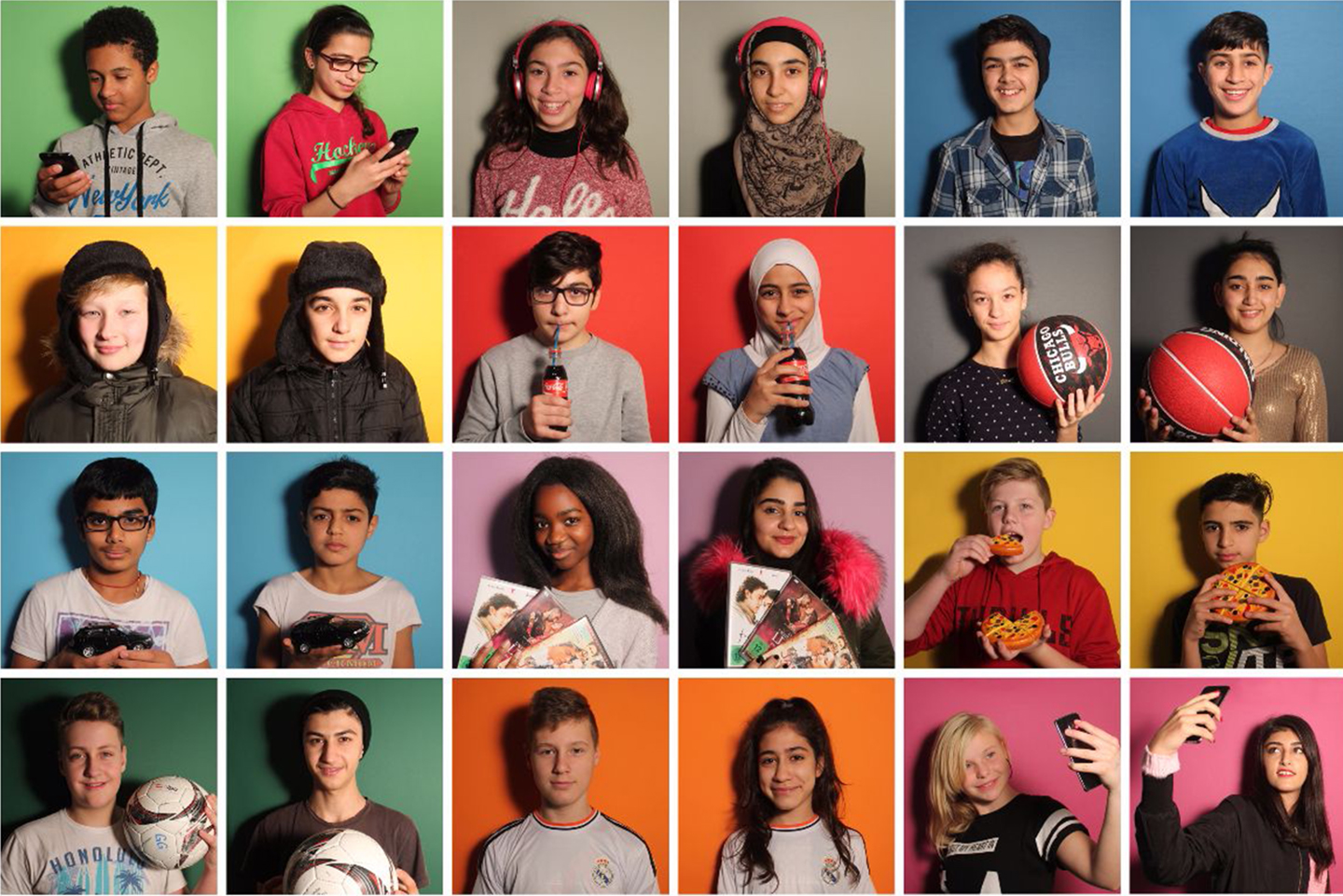 Fotoprojekt mit Kindern aus der Flüchtlingsklasse ZEA-B und der 7b am Goethe-Gymnasium: Direkt neben dem Klassenzimmer der 7b am Goethe-Gymnasium, in der unsere Kunstlehrerin Frau Götz Klassenlehrerin ist, wird die ZEA-Klasse B (Zentrale Erstaufnahme) von Dean Hall unterrichtet. Die Klasse besteht aus Kindern, die aus dem Irak, Afghanistan und Syrien nach Hamburg geflüchtet sind. Im Kunstunterricht haben wir zusammen ein Foto-Projekt realisiert, in dem Gemeinsamkeiten zwischen den Schülerinnen und Schüler beider Klassen fotografisch umgesetzt wurden. Viele Gemeinsamkeiten (z.B. beide lieben Bollywood-Filme oder beide sind Real-Madrid-Fans) kamen durch Partnerinterviews ans Licht. Nachfolgend wurde diskutiert wie die Gemeinsamkeiten fotografisch verdeutlicht werden können. Zudem wurden Portraitfotografie und spezielle Beleuchtungstechniken erläutert, sowie die Aufgaben für das Fotoshooting verteilt. So entstanden 24 Portraitfotos, in denen sich Paare mit gleichen Interessen zusammen gefunden haben. Diese können jetzt als Memory-Spiel aufgedeckt werden. Viel Spaß dabei!