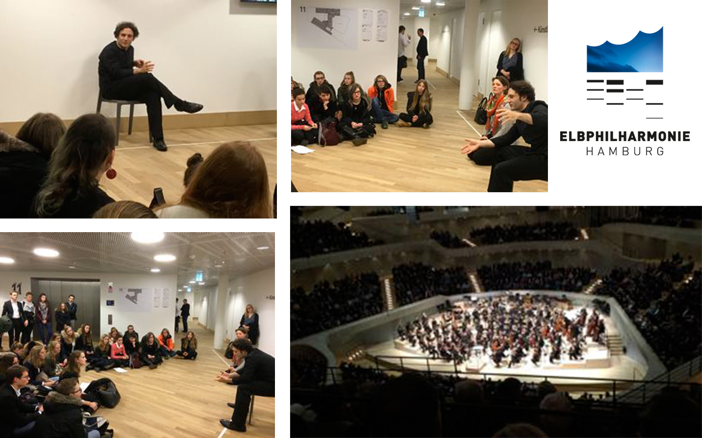 Für einen Teil unseres Kurses begann dieser schon mit der Hinfahrt. Wir näherten uns unserem Ziel zusammen mit Frau Demattia auf dem Wasser – mit der Fähre ging es von den Landungsbrücken zur Elbphilharmonie. Schon von weitem konnten wir im Dunkeln das hell erleuchtete Konzerthaus bewundern!
