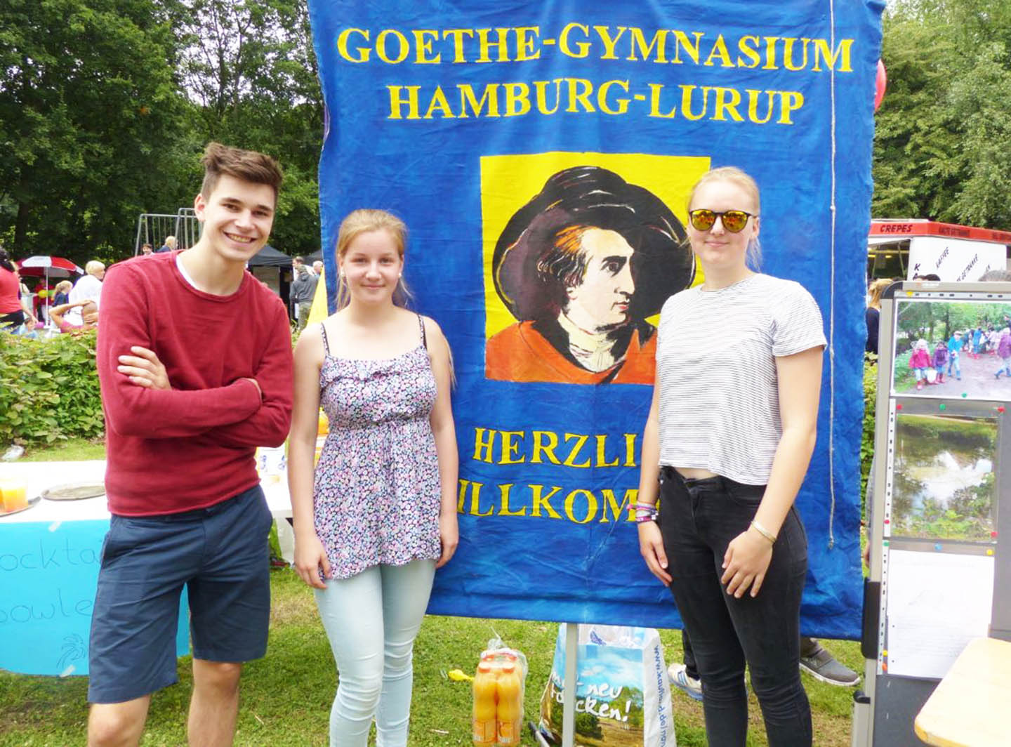 Samstag, 8. Juli 2017: Das Luruper Stadtteilfest hat jedes Jahr viel zu bieten. Erstmalig war nun auch das Goethe-Gymnasium mit einem Getränke- und Informationsstand vertreten und unsere Oberstufenschülerinnen und -schüler kamen rege mit den Festbesucher_innen ins Gespräch und verteilten eifrig unsere neue Schulbroschüre “Wir sind Goethe”.