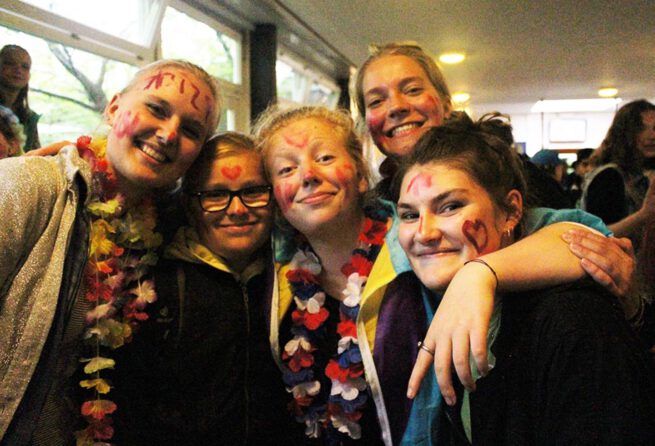Dienstag, den 11. Juli 2017: Das Lehrerzimmer versperrt von lauter Luftballons und Konfetti auf dem Boden – dies ist ganz klar kein normaler Schultag! In der Pausenhalle spielen Frau Adrian, Herr Lenz und unser Direktor Luftgitarre zu Pharrel Williams’ “Happy” und alle SchülerInnen sind bunt angemalt und ja – glücklich! Vor allem unsere Abiturienten, denn es ist ihr gelungener Abi-Streich. Trotz Regen eine tolle und runde Sache!
