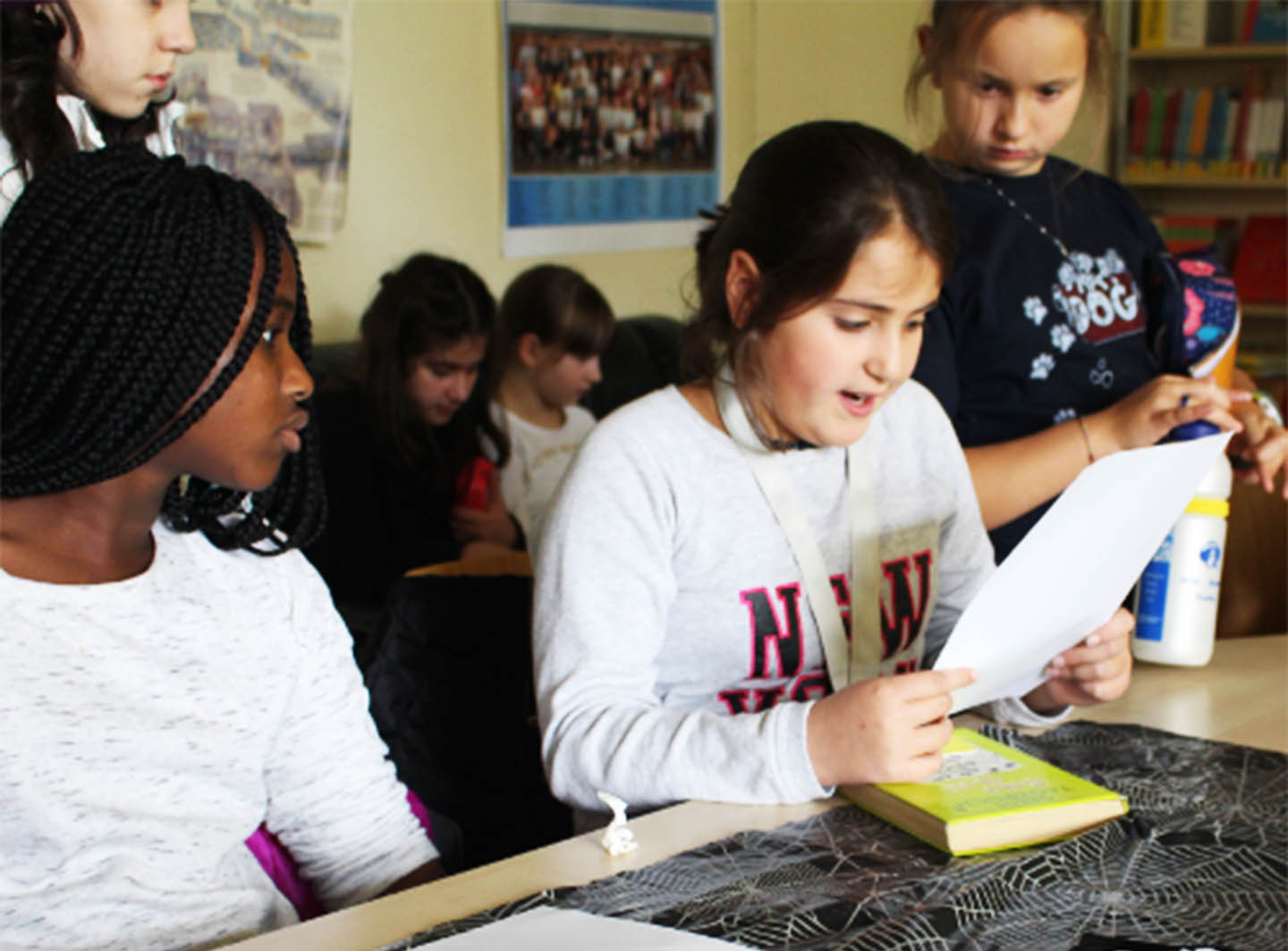 Montag, den 30. Oktober 2017: Kaum schlägt es 12 Uhr in der Bibliothek, tischen sich Spinnenweben auf und klebrige Skeletthände warten auf neue Vorleser_innen der gruseligen Kurzgeschichten zu Halloween. Während Yuna, Lucy und Alara mit zittrigen Händen stimmungsvoll vorlesen, hat die Jury aus Carlotta, Lisa und Buket viel zu tun, denn alle haben total schaurig gelesen und uns das “Fürchten” gelehrt.