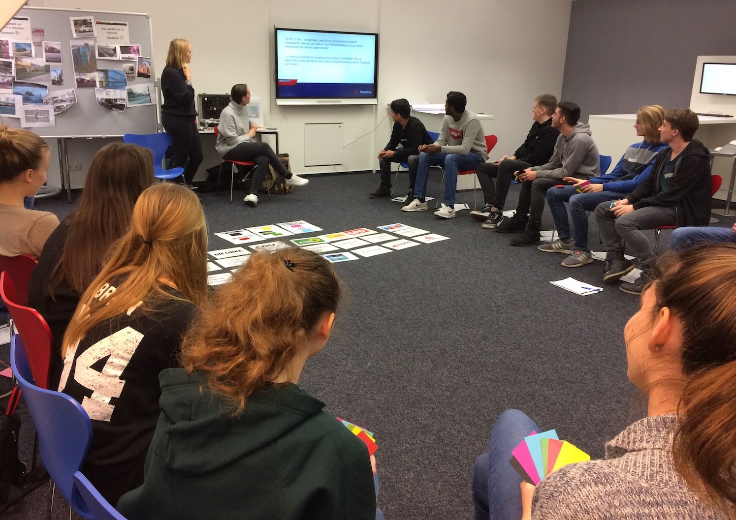 Vor solchen Fragen stand das Profil „Medien und Gesellschaft“, als es am 24. Januar im Rahmen des profilgebenden Fachs PGW den Workshop „Ich will mitmischen!“ der Landeszentrale für politische Bildung besuchte. So ging es für 23 Schüler und Lehrerin Christina Jäger am Donnerstagmorgen in die Zentralbibliothek am Hauptbahnhof. Dort warteten vier Hamburger Jungpolitiker auf uns, um in Kleingruppen für die Fragen und Anliegen der Schülerinnen und Schüler Rede und Antwort zu stehen. Der Kurs hatte sich zuvor mit den zwei Moderatorinnen der Landeszentrale gut auf diese Gespräche vorbereitet, indem sie Missstände in ihrem Stadtteil fotografisch einfangen und dargestellt hatten oder auch die Parteien in ihrer Programmatik voneinander abgrenzten.
