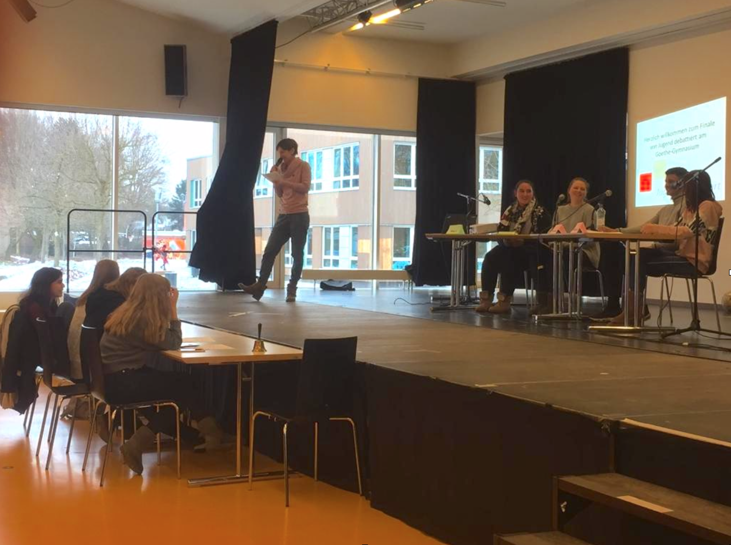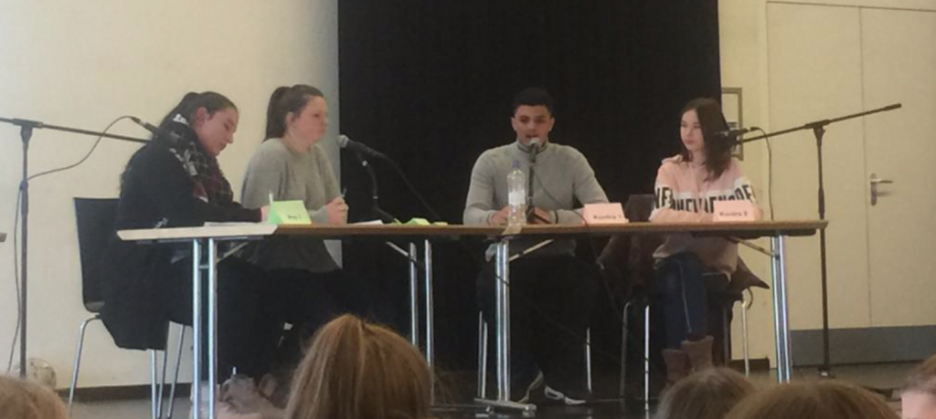 Am 26 Januar 2019 fand der ,,Jugend debattiert“-Wettbewerb am Goethe Gymnasium statt. Aus jeder Klasse wurden Juroren, Zeitnehmer, drei Debattanten und die jeweiligen Vertreter gewählt. Von den zahlreichen Debattanten hatten sich vier in das Finale diskutiert: