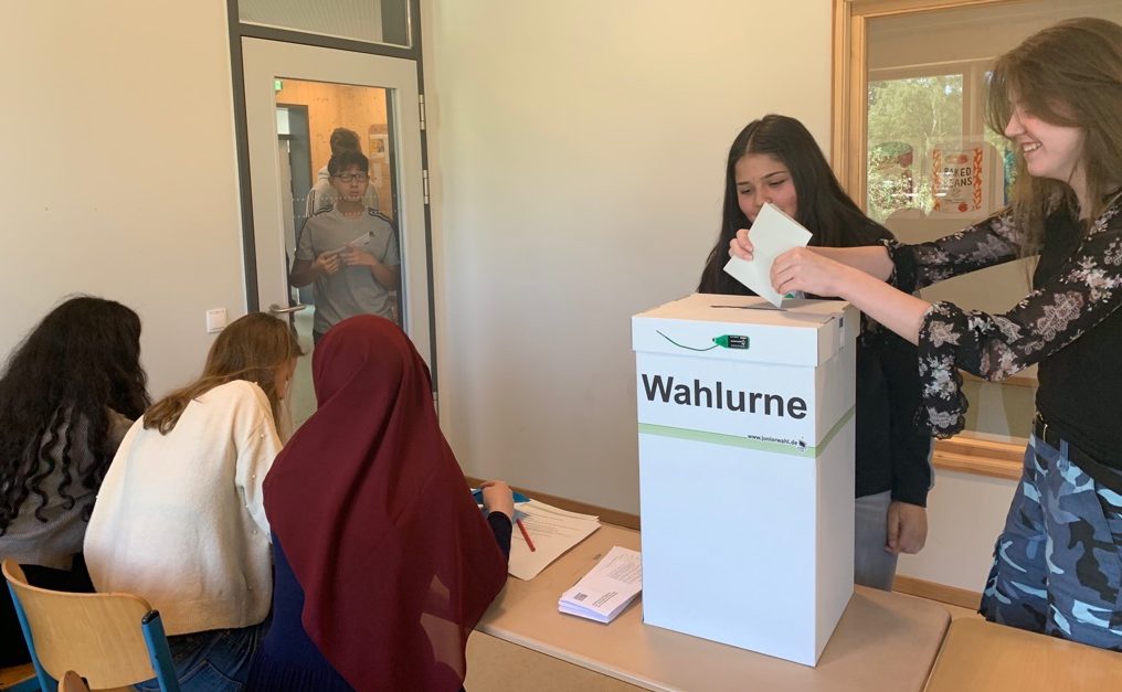 Am Freitagvormittag war es schließlich soweit: Jeder durfte im Wahlbüro seinen Stimmzettel in der Wahlkabine ausfüllen und in die Urne werfen. Die Schülerinnen und Schüler des Profils „Gesellschaft und Medien“ des 11. Jahrgangs waren als Wahlhelfer zugegen, sie glichen Wahlbenachrichtigungen und Ausweise mit den Listen ab, teilten Wahlzettel von nicht unerheblicher Länge aus und zählten schließlich alle Stimmen aus, um sie an die Zentrale der Juniorwahl weiterzugeben – so wie alle anderen der teilnehmenden 2760 Schulen auch. Das Ergebnis wird Sonntagabend auf der Homepage und in diversen sozialen Medien bekanntgegeben. Und es wird spannend: Stimmen die Jugendlichen anders ab, als die Erwachsenen? Und was bedeutet das? Sollte man das Wahlalter möglicherweise wie bei der Bezirksversammlungswahl am Sonntag auch auf 16 Jahre herabsetzen? Diese Fragen werden uns im Unterricht der kommenden Woche beschäftigen.