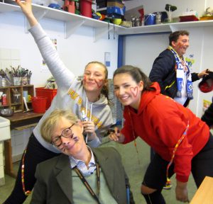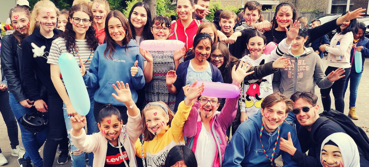 schon von Weitem konnten hoffnungsfrohe SchülerInnen heute morgen um kurz vor neun den sich nähernden Tross gutgelaunter angehender AbiturientInnen bereits hören. Wenig später crashten diese dann auch den Unterricht, verteilten freigiebig Bonbons, übten ihre Schminkkünste an SchülerInnen und LehrerInnen und verbreiteten gute Laune. So bekamen alle einen ersten Eindruck von der Feierkompetenz des Jahrgangs 12.