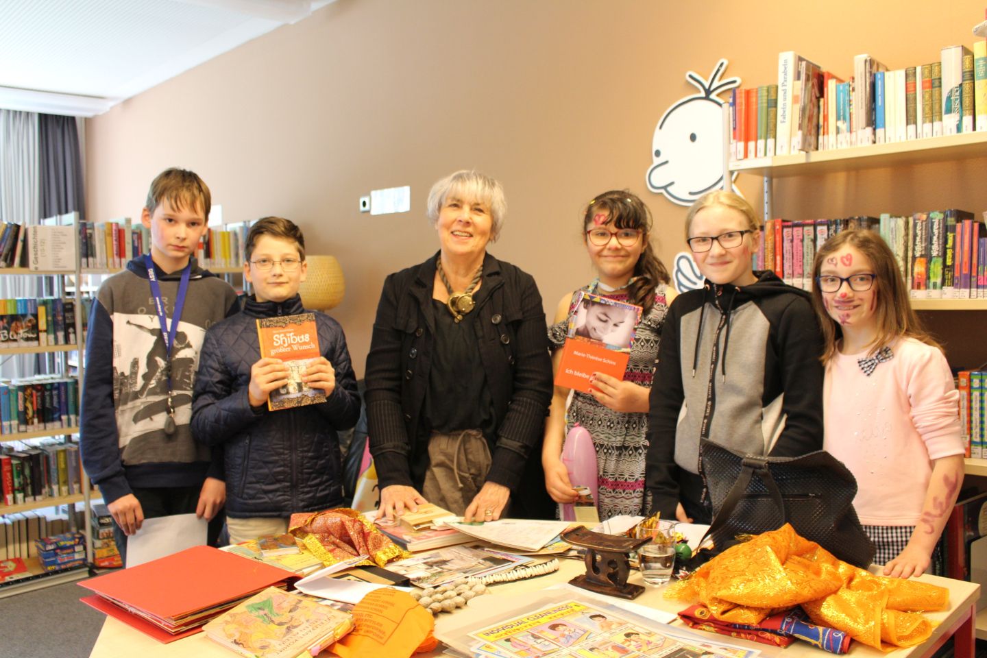 Mittwoch, den 29. Mai 2019: Um die ganze Welt ist sie schon gereist und hat unglaublich viele spannende und bunte Geschichten mitgebracht – Die Rede ist von Marie-Thérèse Schins, die heute für die Klasse 5a von Frau Ali und Herrn Onken in der Schulbibliothek zu Gast ist. Ihr Besuch hat schnell in der Schule die Runde gemacht und so stießen auch noch Schüler*innen aus der 6d spontan zu der Lesung dazu. Vielen Dank an Frau Schins, die uns vor allem das Leben der Kinder in Indien und Afrika ganz nah gebracht hat! Der Bibliothek hat sie eine wundervolle Auswahl ihrer Bücher geschenkt, die ihr ab sofort ausleihen könnt. Wir laden sie unbedingt wieder ein – es war großartig.