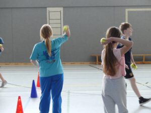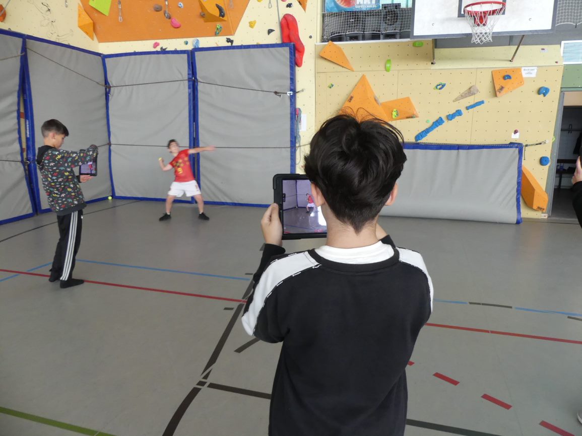 Auch im Sportunterricht werden digitale Medien eingesetzt. So bearbeitet die Klasse 6D in einer Stationsarbeit zum Schlagballwurf unter anderem auch eine Station mit einer Videoanalyse. Mit den iPads der Sportfachschaft kann die Wurfbewegung der MitschülerInnen in Zeitlupe angesehen und analysiert werden. Im anschließenden Brennballspiel werden dann verschiedene Wurftechniken taktisch erprobt.
