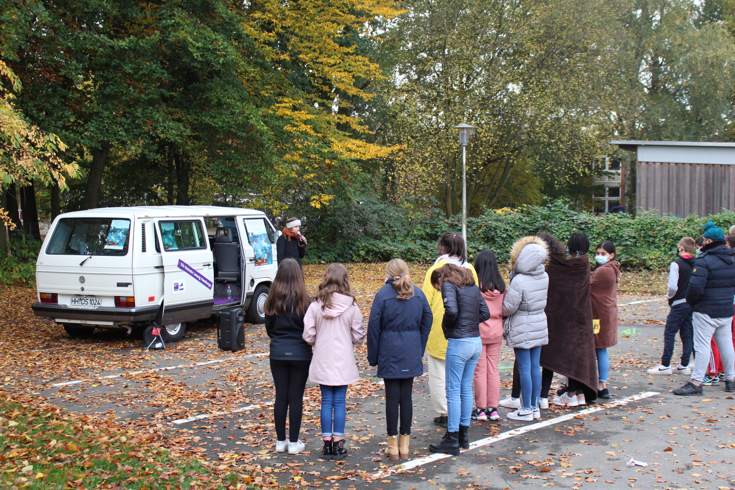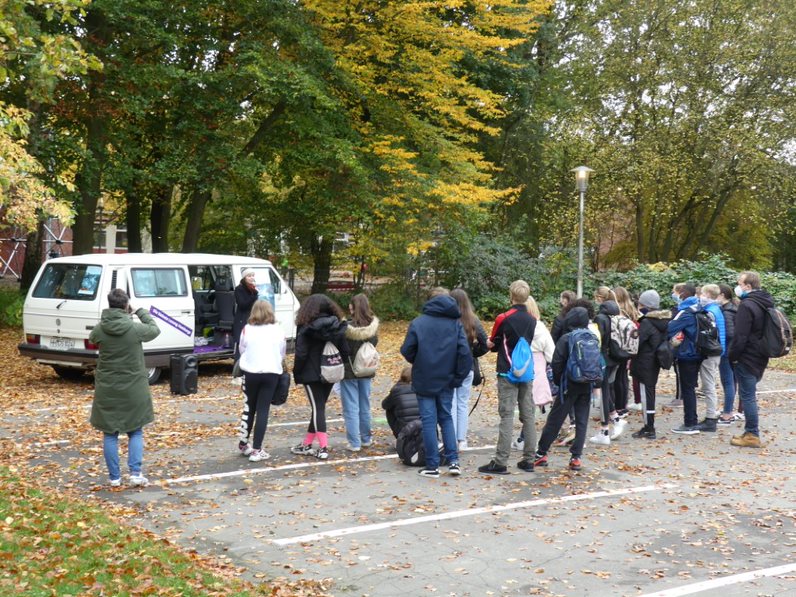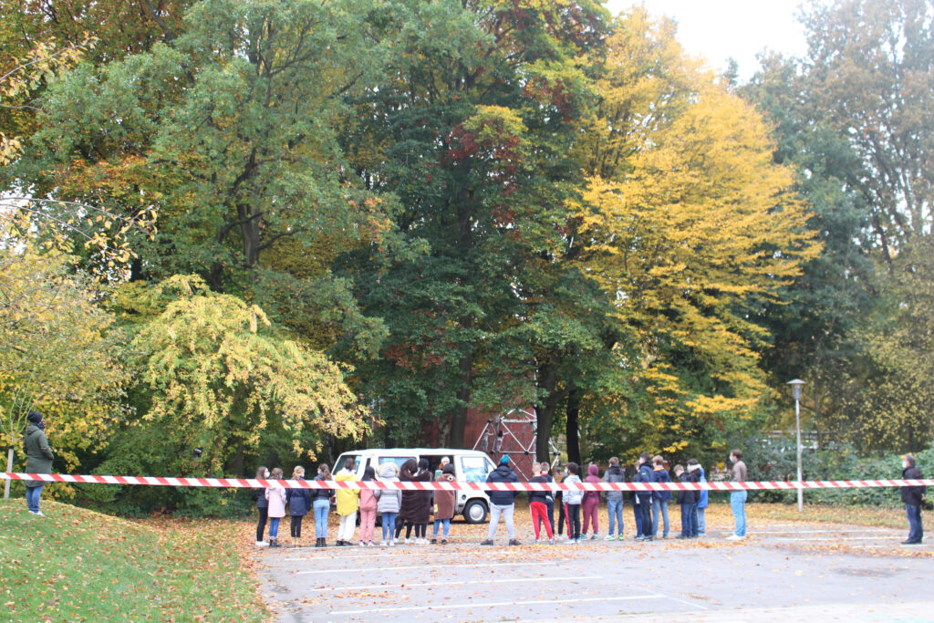 Was aus der Ferne durch das Absperrband einen Tatort vermuten ließ, entpuppte sich bei genauerem Hinsehen als Bühne: Eine geballte Portion Lyrik präsentierte die Kielerin Mona Harry den siebten Klassen am Dienstag, den 27. Oktober 2020 auf ebendieser im Rahmen des Lesefestes Seiteneinsteiger. Der Großteil der Schülerschaft war von Monas Wortakrobatik begeistert. So sagte eine Schülerin der 7c, dass sie nicht erwartet hätte, dass es so gut wird. Der historische VW-Bus von Joachim Herz, dessen Stiftung diese Veranstaltung überhaupt ermöglichte, fährt einmal im Jahr als Kleinste-Lesung-Bus von Schulhof zu Schulhof. On board sind immer unterschiedliche Autor:innen, die dem jungen Publikum die deutsche Literatur näher bringen wollen. Der Mona ist dies mit ihren beiden gesellschaftskritischen Texten u.a. über Lillifee und Geschlechterrollen durchaus gelungen!