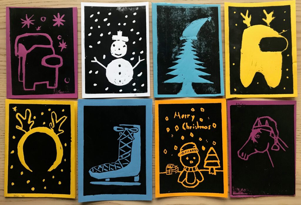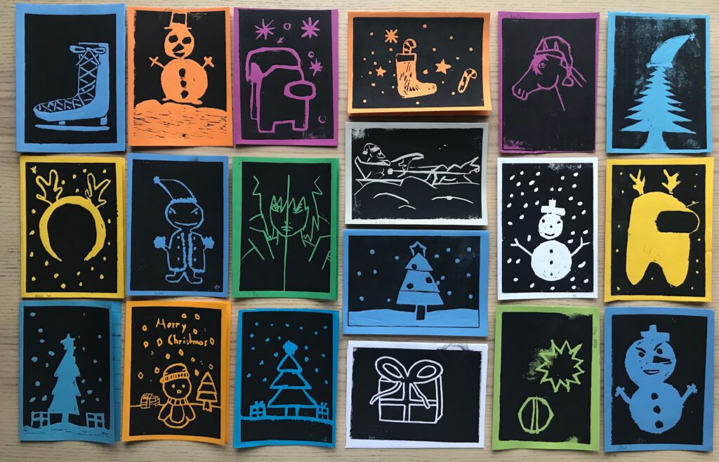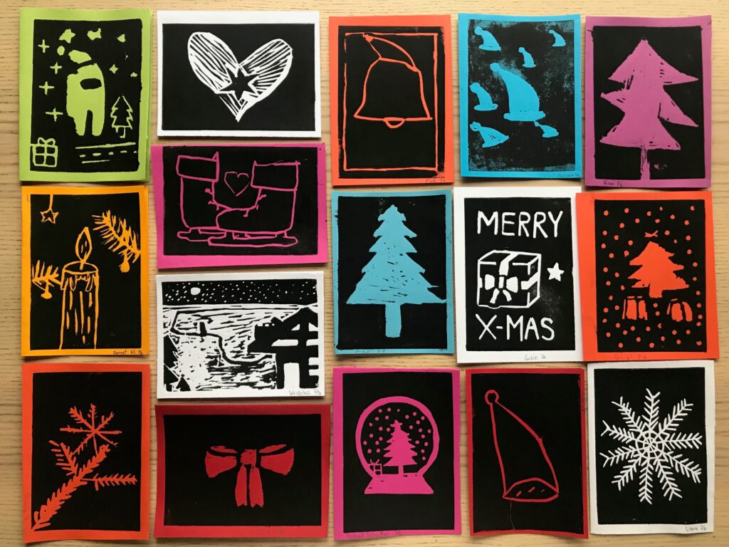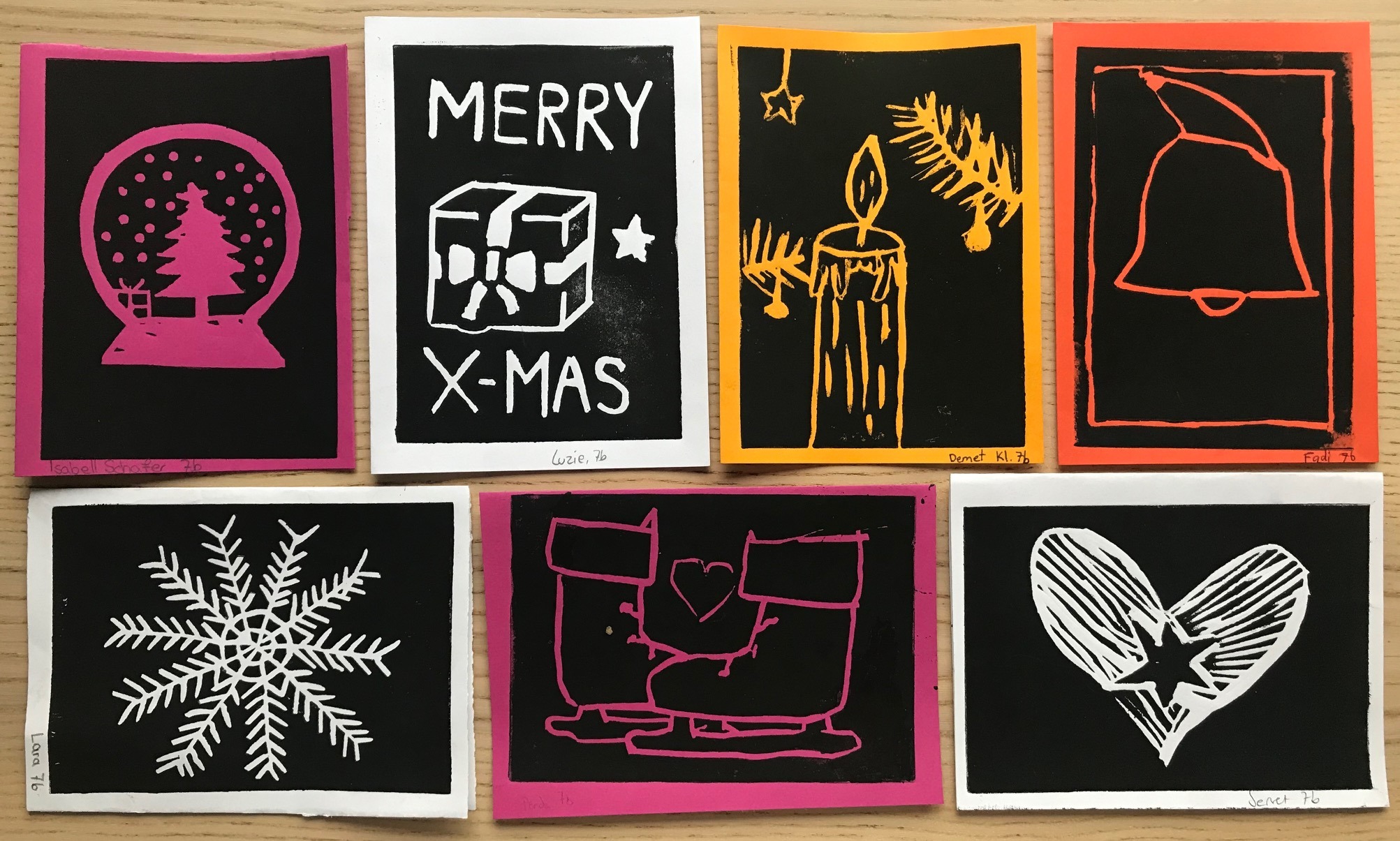 In den letzten Wochen glich der Kunstunterricht in Jahrgang 7 bei Frau Götz und Frau Eckert einer Wichtelwerkstatt: Weihnachtsmotive überall, dazu Linoleumplatten und Schnitzmesser, schwarze Druckfarbe, farbiges Papier und ab zur Druckpresse – fertig waren die Weihnachtskarten! Es wurden so viele tolle Karten gedruckt, dass klar war: das geht über den eigenen Bedarf an eine Karte für Oma und Opa hinaus. Also, wer könnte sich noch über eine Weihnachtskarte freuen? Zum Glück hat Frau Götz über ihre ehemalige Nachbarin (die gerade 100 Jahre alt wurde) Kontakt zu einem Seniorenzentrum in Eimsbüttel. Und dort werden nun 38 mit Weihnachtswünschen beschriebene Karten an 38 Bewohnerinnen und Bewohner überreicht – was für eine Freude!