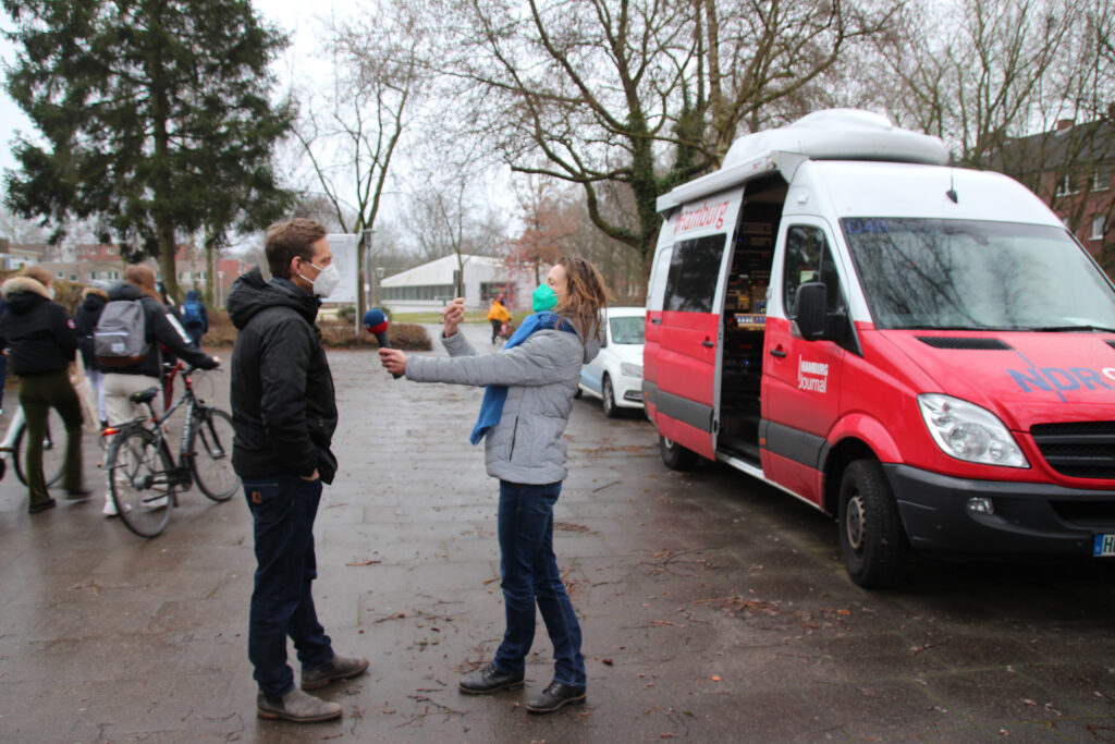 Heute starteten in diesen Jahrgängen die A-Gruppen, morgen kommen die B-Gruppen. Empfangen wurden die Schüler*innen bereits vor Unterrichtsbeginn am Schultor durch die Schulleitung, die die Reiserückkehrer-Erklärung einsammelten und vom NDR, der unseren Schulleiter Herrn Scherler und einzelne Schüler*innen zu der derzeitigen Situation interviewte. Hier geht es zu dem Live-Interview!