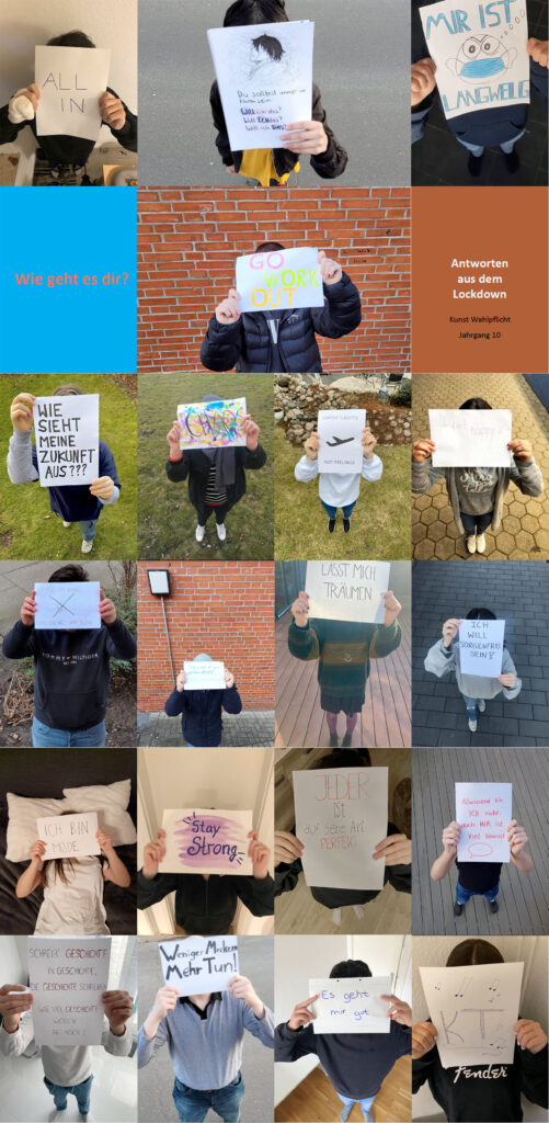 Irgendwie scheint die Welt stillzustehen und ein Tag vergeht wie der andere. Deshalb habe ich die Schüler:innen aus dem Kunstkurs Jahrgang 10 gefragt: „Wie geht es dir“. Die Antworten werden uns hier auf einer 1-Personen-Demonstration entgegengehalten.
