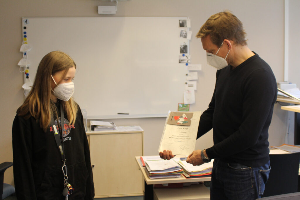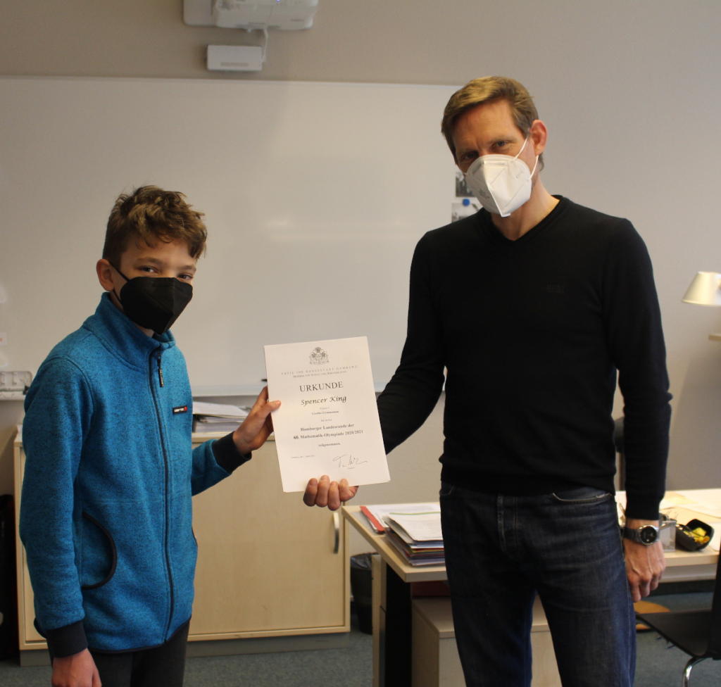 Doch Lisa Koop, Spencer King (beide 5b) und Nicolas Reisch (5c) waren in das Büro des Schulleiters, Frank Scherler, eingeladen worden. Dort überreichte dieser ihnen im Beisein der Abteilungsleiterin Conny Haddorp und der Mathe-Fachleiterin Sybille Reif ihre Urkunden der Landesrunde der diesjährigen Matheolympiade.
