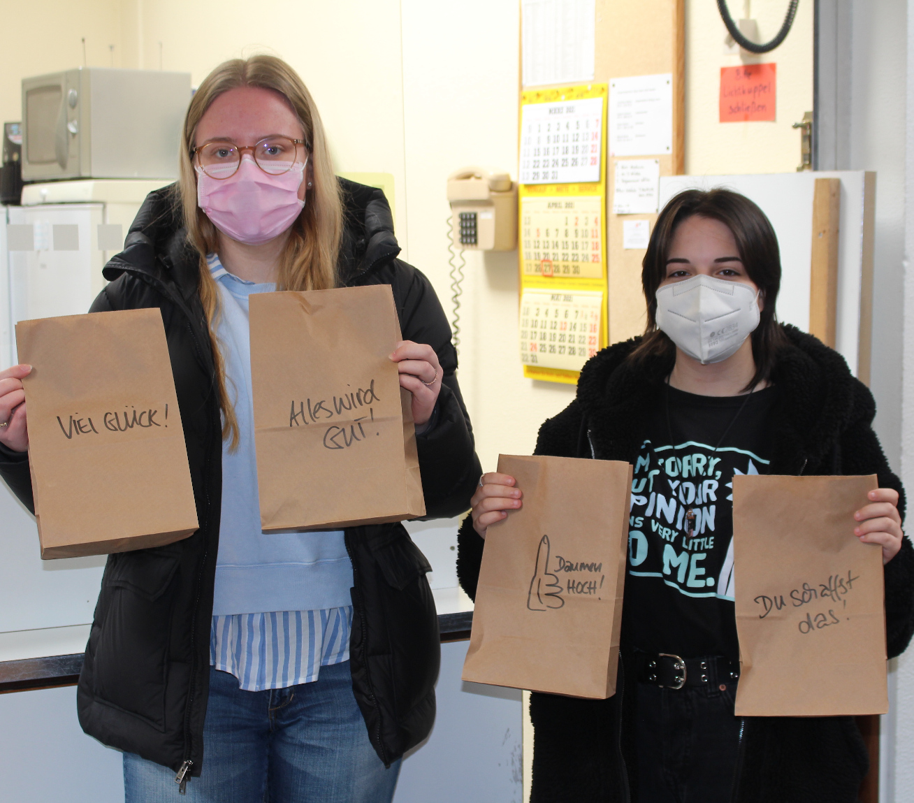 Dienstag, den 27. April 2021: Wenn das nicht süße Kurierinnen sind- Während unsere Abiturient*innen im Forum fleißig schreiben, hat Frau Scherer vom Café Goethe liebevoll jede Lunchtüte mit einem Motivationsspruch versehen und Frau Süllner und Herr Zimmermann haben diese mit lauter aufbauenden Leckereien gefüllt. Von Traubenzucker über Müsliriegel fehlte auch ein glücksbringender Schoko-Marienkäfer nicht, der die besten Eingebungen bescheren wird. Ganz viel Erfolg auch heute wieder an die Zwölftklässler*innen!