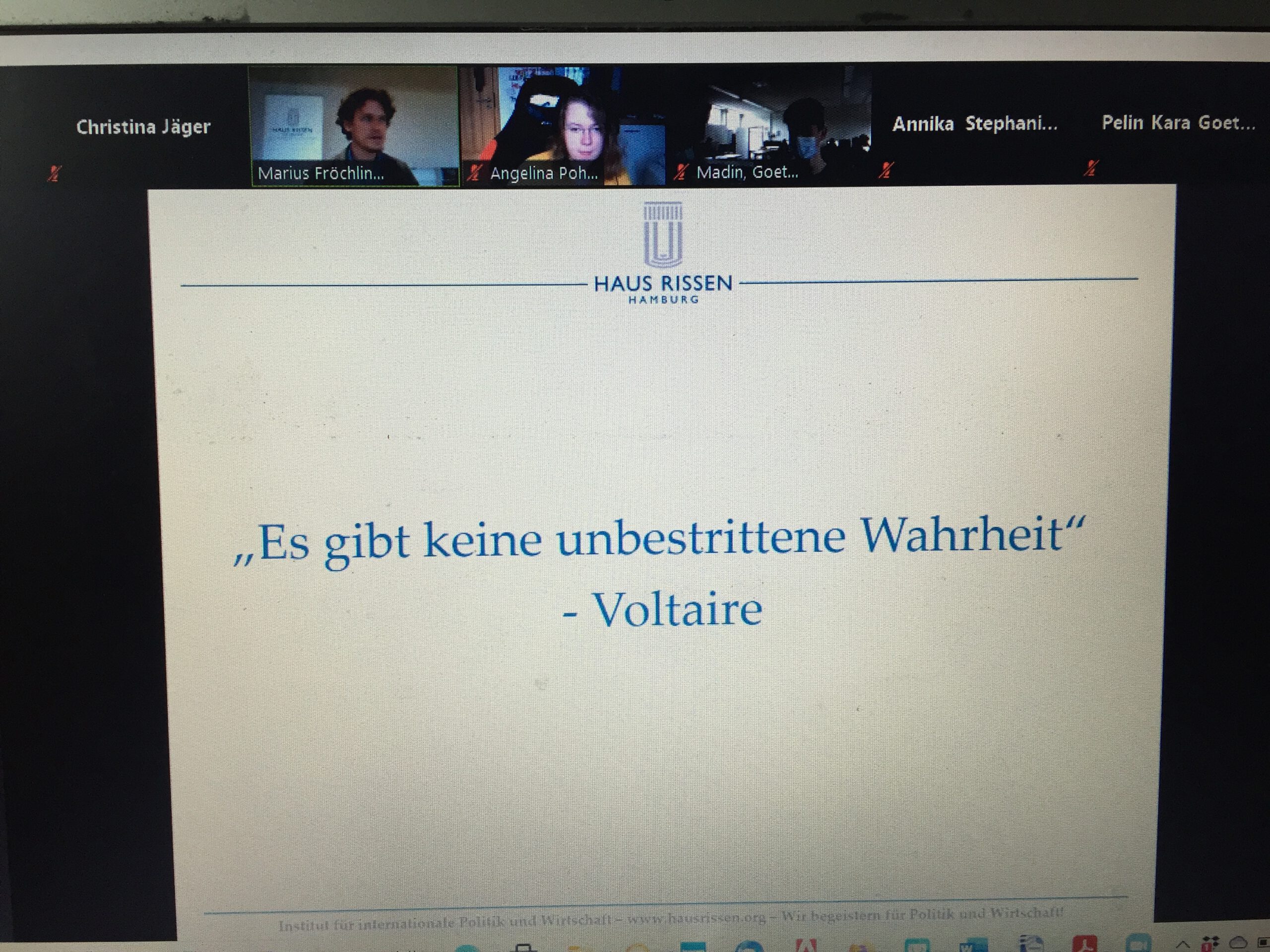 „Was ist denn der Effekt einer Schweigespirale, was bewirkt eine Filterblase?“ In der Online-Veranstaltung „Medien und Politik“ ging das PGW-Profil von Frau Jäger unter anderem diesen Fragen nach. Das Haus Rissen bietet dieses Seminar aktuell für Hamburger Oberstufenschüler:innen an, um ihnen das Zentralabithema näher zu bringen und auch die Möglichkeit zu bieten, sich mit Schülerinnen und Schülern anderer Schule auszutauschen. So konnten unsere „Goethianer“ hören, was Gleichaltrige vom Heisenberg-Gymnasium etwa zur Frage der Privatisierung öffentlich-rechtlicher Medien zu sagen hatten und selbst ihre Kenntnisse und Meinungen zu parteinahen Journalisten oder Fakenews äußern. Die eine Hälfte nahm vom Computerraum in der Schule teil, die andere Hälfte vor dem Laptop zu Hause. Referent Marius Fröchling ordnete die Themen in einen interessanten übergeordneten Rahmen ein, bis hin zur Frage „Was ist eigentlich die Wahrheit?“. Die Antwort darauf haben wir nicht gefunden, aber viele interessante Erkenntnisse konnten wir definitiv mitnehmen. Finanziert wurde das Ganze übrigens von einer großen Stiftung, weswegen unsere PGWler gratis in den Genuss kamen.