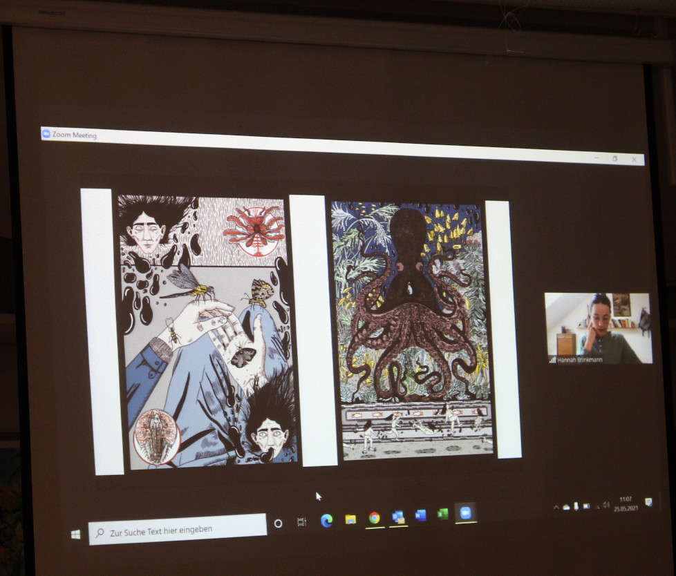 Dienstag, den 25. Mai 2021: Hannah Brinkmann hat für ihre Graphic Novel ein historisches Thema gewählt. Die Auseinandersetzung mit den Kriegsdienstverweigerern in den 1970er Jahren scheint zunächst für eine visuelle Umsetzung recht kompliziert – viele historische Dokumente, Briefwechsel, Protokolle, Presseberichte… Wie kommt eine junge Zeichnerin zu solch einem Thema? Zunächst greift Hannah Brinkmann hier tatsächlich die tragische Geschichte ihres eigenen Onkels Hermann auf, der nicht entgegen seiner moralischen Vorstellungen handeln wollte und letztlich an seiner Einberufung seelisch zerbrochen ist. Diese Tragik, die Zerrissenheit und das Ringen eines jungen Menschen um seine Ideale, die Auseinandersetzungen in der Familie und Gesellschaft machen das Thema spannend. Die Zeichnungen im Buch zeugen von dieser Spannung und bersten vor Emotionen! Für die SchüerInnen des Kunstprofils am Goethe zeigte sich, dass sich Hannah Brinkmann Inspiration bei tragischen Künstlerpersönlichkeiten wie Edvard Munch und Frida Kahlo geholt hat, um die dramatischen Szenen überzeugend zu gestalten. So wird aus staubigen Dokumenten eine packende Geschichte!