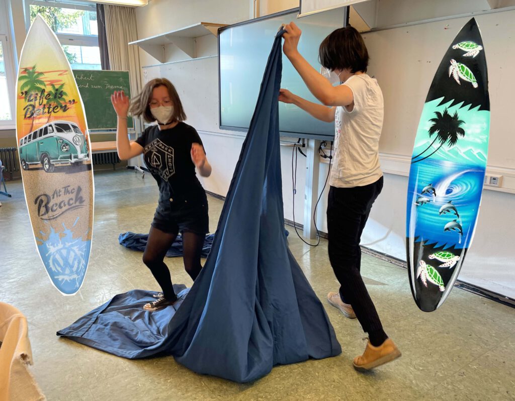 Donnerstag, den 17. Juni 2021: Der heißeste Tag in Hamburg – wer würde da nicht gerne an den Strand und ab in die kühlen Wellen? Genau diese Erfrischung gönnt sich die Kunstklasse 9 von Frau Götz! Für die Spontanperformance brauchen wir nur den blauen ausgedienten Vorhang, ein paar imaginäre Surfbretter und Musik aus der Boombox – und natürlich uns als die perfekten “Lords of the Boards”. Wenn da bloß nicht dieser weiße Hai wäre…