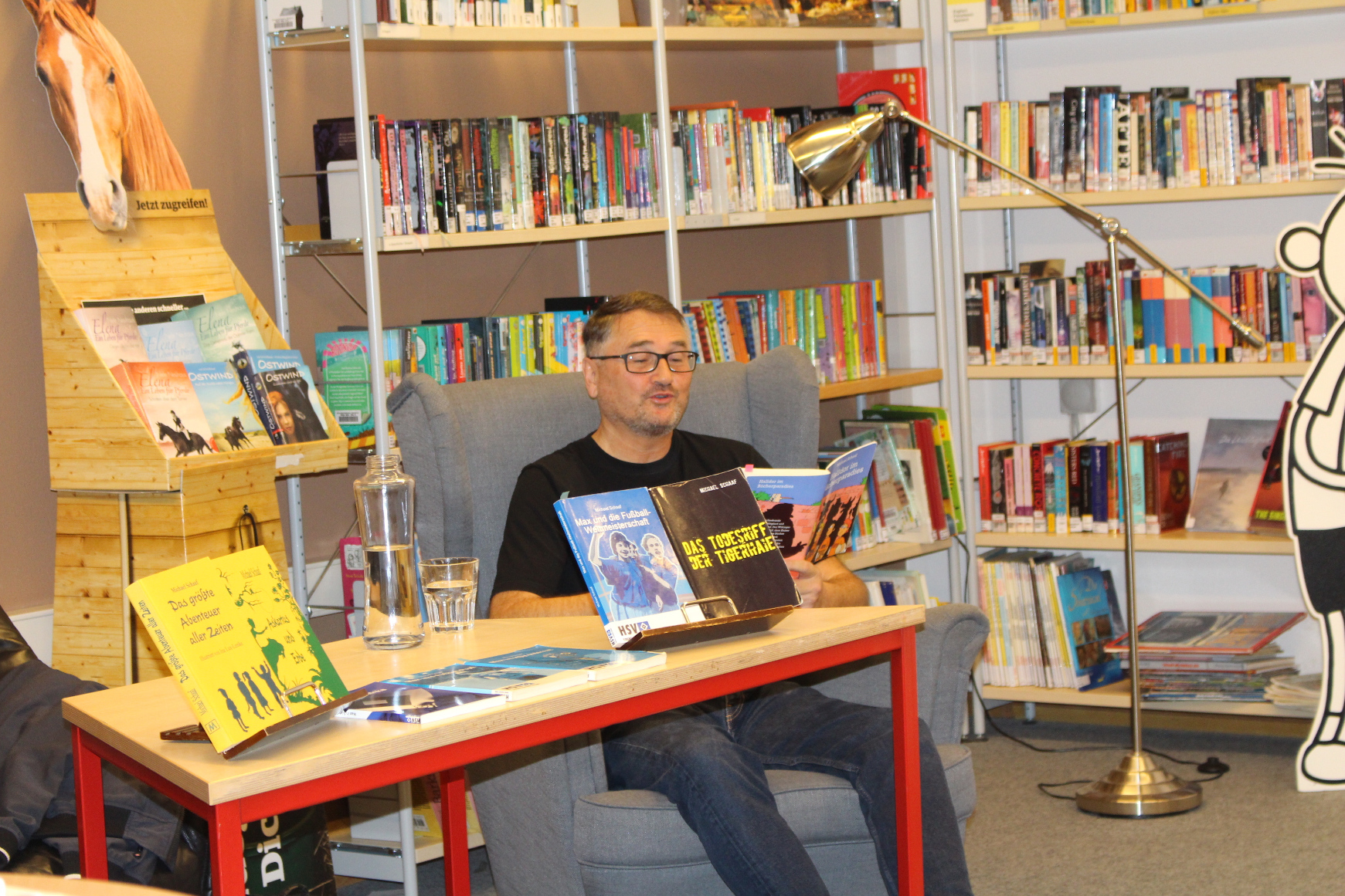 Donnerstag, den 16. September 2021: Dieser passt perfekt zu unserer Themenwoche zum Anti-Mobbing. Bernd ist nämlich der sprichwörtliche Obermobber und eine der Hauptfiguren in Michael Schaafs Roman von “Halldor im Bücherparadies. Dieses hat er heute mit unserer Schulbibliothek ausgetauscht und die Klasse 5b ist mit der Klassenlehrerin Frau Eckert zu Besuch und völlig begeistert, wie witzig und voller Tatendrang Herr Schaaf das Geschehen auf der kleinen Bühne (mit ausreichend Abstand natürlich) vorträgt. Im Als Herr Dührkop in der darauffolgenden Stunde fragt, wie die Kinder die Lesung fanden, kommt eine ganz klare Aussage von Sabrin: “Immer, wenn ich in Zukunft traurig sein sollte, werde ich mir das Buch von Halldorn durchlesen. Es bringt einen sofort zum Lachen!” Schaut also gerne auch mal in die Abenteuer der Bücherbande herein.