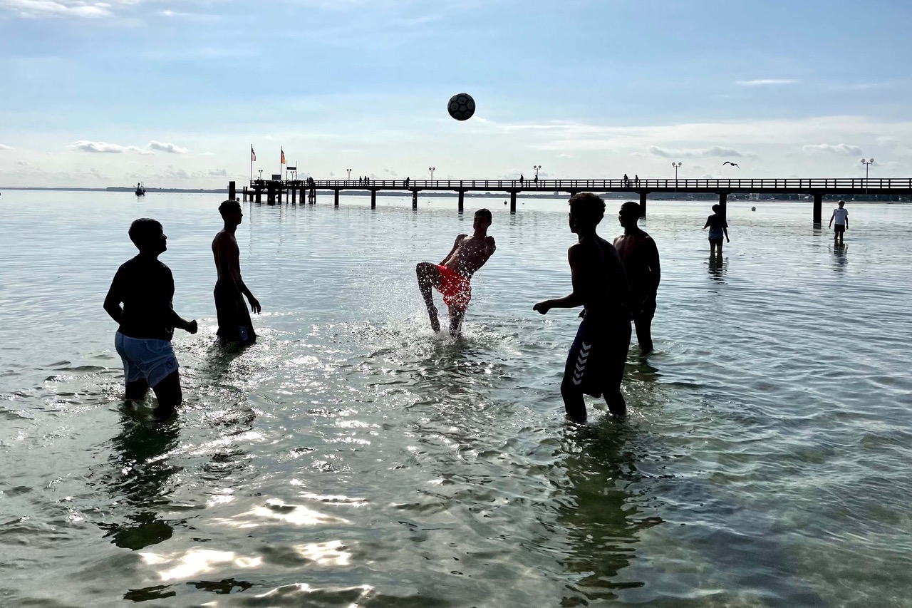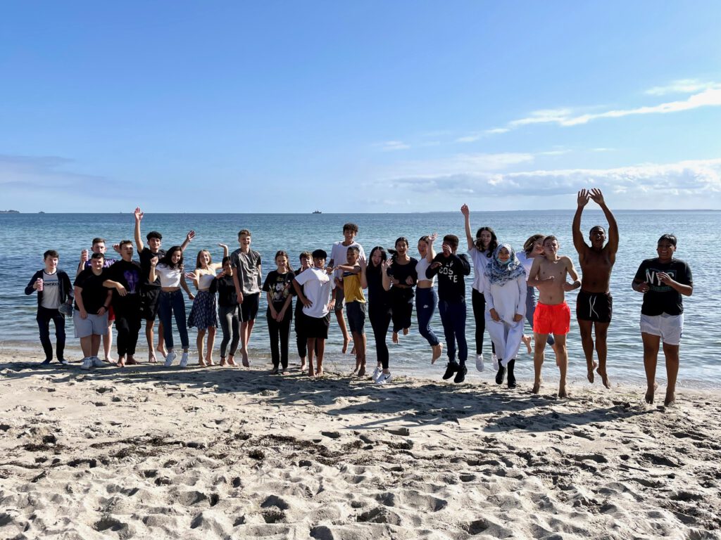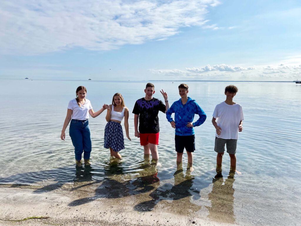 das Meer war klar und der Sand fein wie auf Ko Samui. Dabei war jeder für seine eigene Langeweile am Strand verantwortlich! Die Warnung von Frau Götz als Klassenlehrerin hat gesessen: die Strandtaschen der 9b waren voll mit Beach-Volleybällen, Federbällen, Stranddecken, Musikboxen, Sonnencreme und einer Tüte Chips, die dann von der Ernährungspolizei entfernt wurde – einer Möwe! Dass man am Strand gerne ohne Socken rumläuft hat am Ende die halbe Klasse gezeigt und die andere Hälfte war mit den Kollegen aus der 9d und einem Fussball nur noch im Wasser zu sehen – Respekt! Denn 19 Grad Wassertemperatur ist einfach nicht Thailand. Aber liebe Ostsee: wir kommen wieder!
