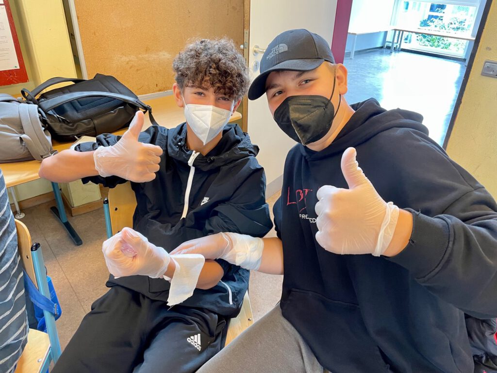 Die Kursleiterin der 9b hat außerdem immer wieder betont, was wirklich wichtig ist: lieber den Notruf (112) einmal zu viel als zu wenig rufen und ebenso wichtig, egal was passiert ist: die psychische Betreuung, die wirklich jeder leisten kann.
