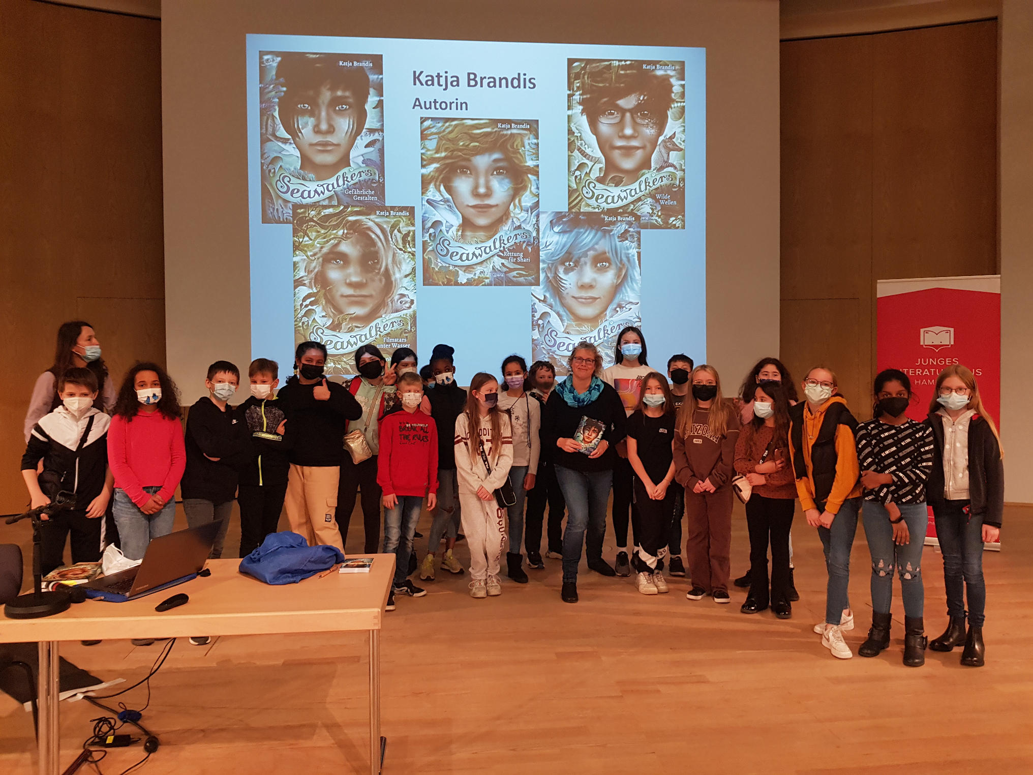 Donnerstag, den 23. September 2021: Heute ist der grossartigste Tag für die Klasse 5a in Begleitung ihrer Deutschlehrerin Frau Baumeister und dem Klassenlehrer Herr Onken. Es geht in die Jugendmusikschule nach Harvestehude. Musik hören wir dort zwar nicht, aber wir treffen auf die angesagteste Autorin überhaupt. Nämlich Katja Brandis. Katja erzählte uns ganz exklusiv, wie sie zum Schreiben gekommen ist. Dies war auf einem Zelturlaub mit ihrer Familie, in dem es allerdings nur regnete und nichts unternommen werden konnte. Damals war sie so alt wie wir heute. Ihre Abenteuerlust setzte sie mit Papier und Stift um. Mehr Erfahrungen sammelte sie auf ihren zahlreichen Reisen, wie z.B. nach Florida, wo Alligatoren so normal sind, wie bei uns Katzen und Hunde. Natürlich nahm uns Katja mit in die Welt der Seawalkers, indem sie uns aus Band 1 und 2 vorlas. Beim anschließenden Quiz gewann Karlotta eine Kette mit 3 Delfinflossen! Und durch Kübras Frage, ob Frau Brandis alle ihre Bücher selbst illustriert, erfuhren wir, dass sie zwar sehr gut schreiben kann, aber das Zeichnen einer professionellen Künstlerin überlässt.