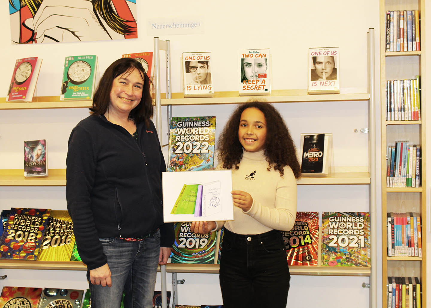 Mittwoch, den 10. November 2021: Endlich ist es soweit! Jaineba aus der Klasse 5a von Frau Schwarz und Herrn Onken überreicht völlig stolz ihr selbst entworfenes Logo für die Schulbibliothek. Frau Schramm freut sich sehr über die neue Farbenpracht, die die Vielfalt und Buntheit der Bibliotheksmedien perfekt widerspiegelt.