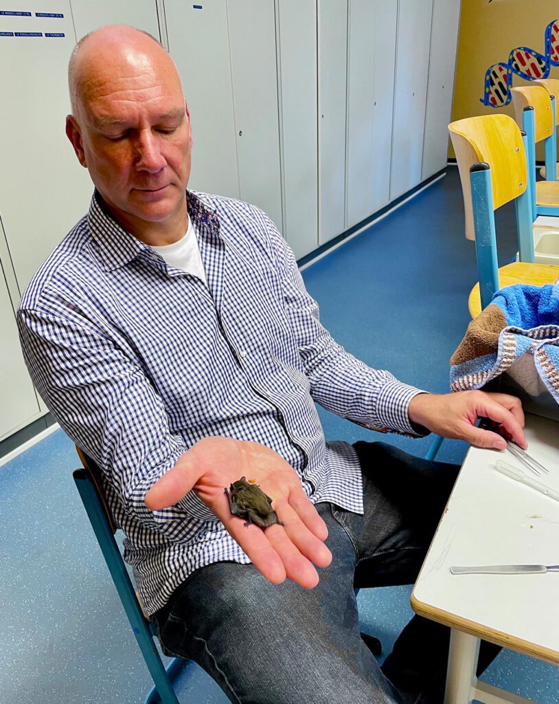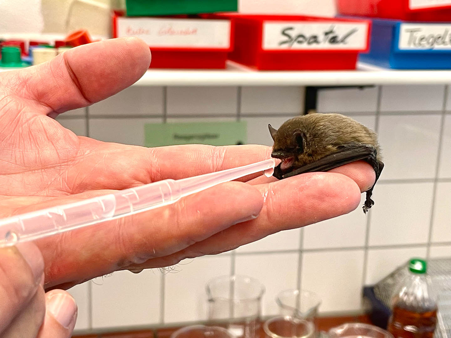 Einen Besucher der etwas anderen Art hatte sich in die Chemie-Sammlung verirrt: Ein kleine Fledermaus hatte sich auf der Suche nach einem warmen Plätzchen ein offenes Fenster gesucht und auch gefunden. Leider gab es dort über das Wochenende keinen Zimmerservice, so dass der kleine Besucher völlig entkräftet war. Zum Glück haben wir unseren Batman am Goethe: Frank Manthey. Mit ein paar Tropfen Wasser aus einer Pipette und ein paar Mehlwürmern aus der Biosammlung war die kleine Feldermaus bald wieder munter und konnte am nächsten Tag wieder in die Freiheit entlassen werden.