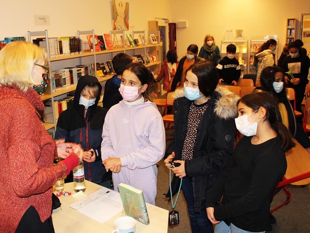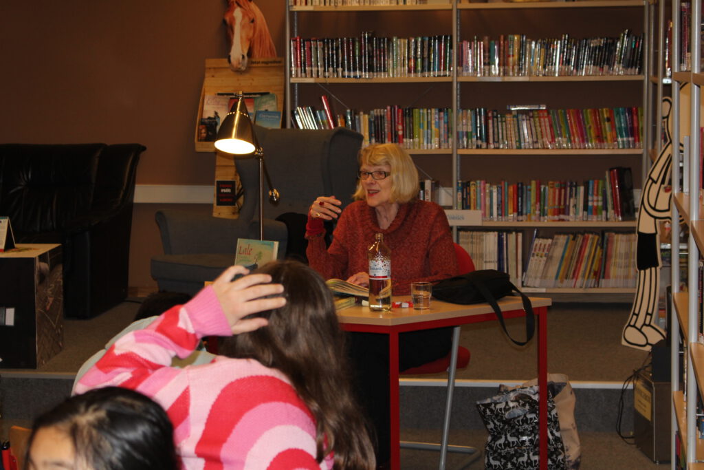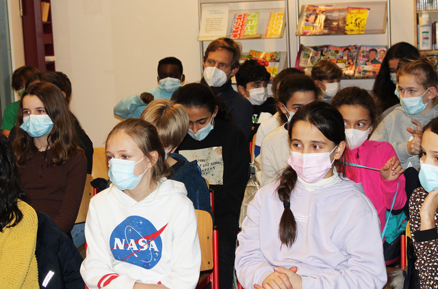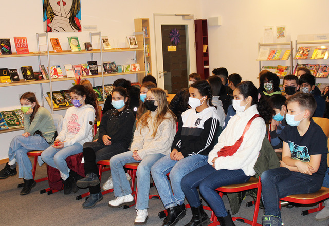 Auch Herr Scherler gesellte sich unter die lauschenden Fünftklässler:innen. Coronafreundlich hatten wir diese in zwei Gruppen aufgeteilt. In der 1./2. Stunde war die Klasse 5a von Frau Schwarz und Herrn Onken mit ihrer Deuschlehrerin Frau Baumeister zu Gast und in der 3./4. Stunde begleitete Frau Lindow die 5c von Frau Haddorp und Henne. Ecrin und Dila liehen sich daraufhin begeistert Frau Venskes Kinderroman “Lale und der goldene Brief” aus, den sie auch im Rahmen der Leseliste einbringen können.