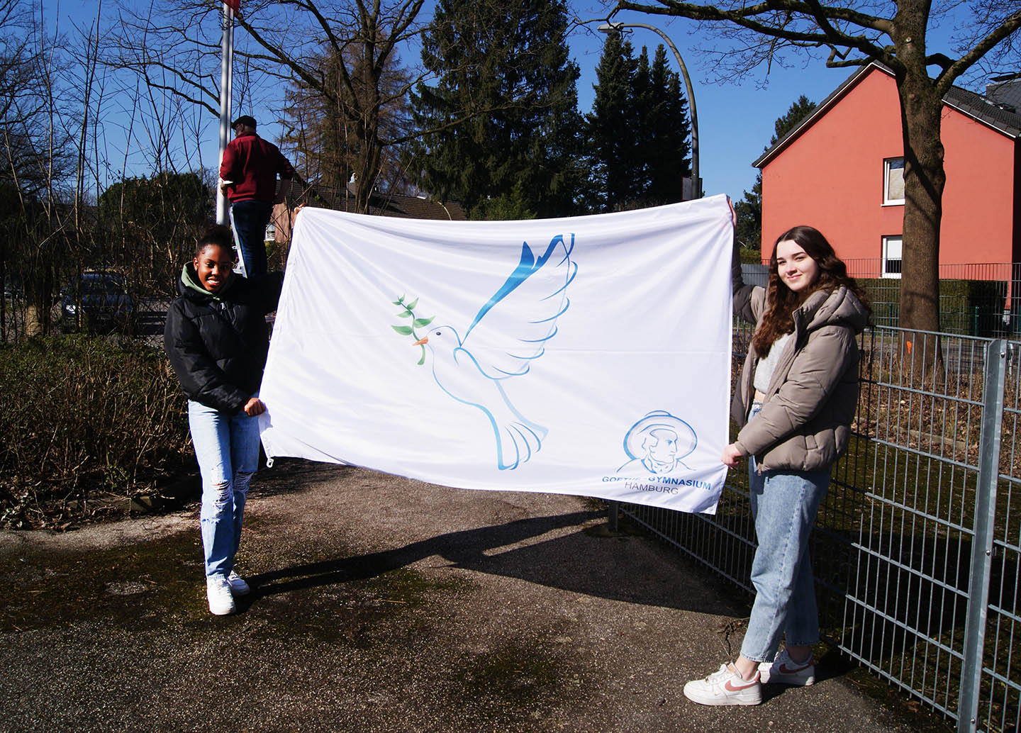 Ein Krieg in Europa ist ein Krieg vor unserer Haustür – Schüler:innen unserer Klasse haben Verwandte in der Ukraine und Russland. Der Krieg in der Ukraine geht uns alle an, macht uns alle betroffen, traurig und sprachlos. Uns ist aber allen klar, dass es in anderen Ländern ebenfalls Krieg gab und auch immer noch gibt; deshalb sprechen wir hier über den Frieden weltweit. Wir wollen nicht nur reden und wir können nicht einfach zum Alltag übergehen. Im Klassenrat haben wir, die 10c, diskutiert, was wir tun können und haben uns alle darauf geeinigt, dass wir mit einer Friedensfahne zumindest ein kleines Zeichen setzen wollen – ein Zeichen gegen den Krieg, ein Zeichen für den Frieden weltweit. Mit der weißen Flagge am Eingang wollen wir genau dies zeigen.