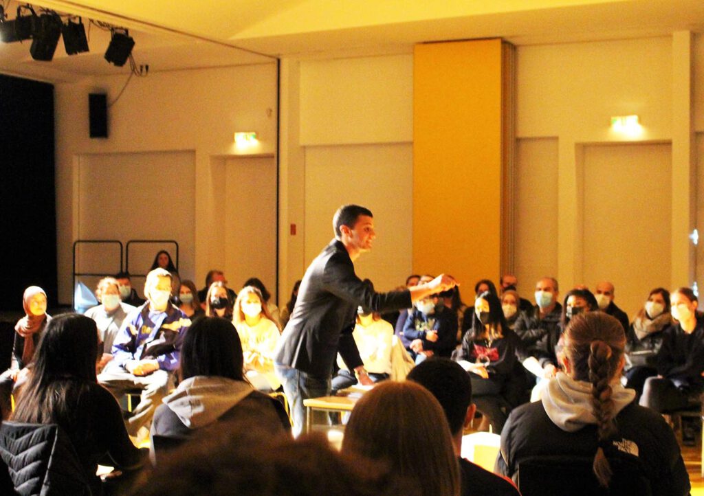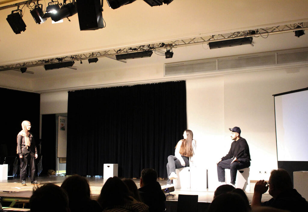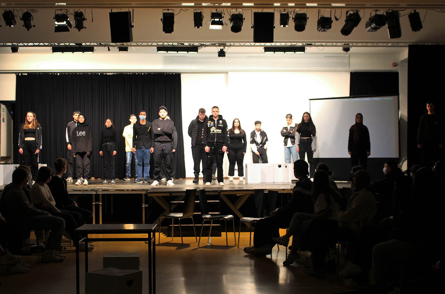 Endlich wieder Theater! Trotz zahlreicher Corona-Hürden präsentierte am Donnerstag, den 07. April 2022 das PGW-Profil (S4) des Goethe-Gymnasiums unter der Leitung ihrer Theaterlehrerin Anne Karstädt eine Adaption des Coming-of-Age-Romans Sonne und Beton von Felix Lobrecht. Dabei sorgte die eigens entwickelte Inszenierung vor ausgebuchtem Haus für eine Stunde Unterhaltung, vollgepackt mit Gags und verstörenden Tatsachen. Das Ensemble erzählte eine Geschichte über die Ungerechtigkeiten des Systems, erlebt von Jugendlichen vom Block. Mitten im Geschehen befand sich das Publikum. Die variantenreiche Bühnenform erlaubte Interaktionen und überzeugte mit effektvollen Video- und Musikeinspielungen; schockierende Zitate und authentische Jugend-Sprache regten zum Nachdenken an. Wie sehr Stereotype und Rassismus unseren gesellschaftlichen Alltag prägen, führte das Ensemble dem Publikum so geschickt und schonungslos vor Augen. Am Ende gab es für die beeindruckende Leistung nicht nur Blumen für alle am Theaterstück Beteiligten, sondern auch tosenden Applaus und Standing-Ovations vom Publikum.