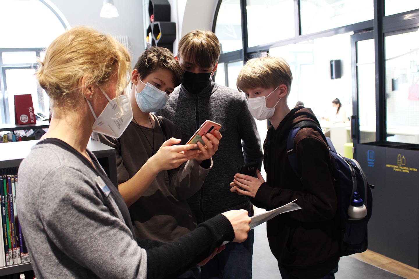 Mittwoch, den 20. April 2022: Der Diffkurs “Fiction Rocks” machte sich zusammen mit den “KoolenKids” auf den Weg in die Innenstadt, um die Zentralbibliothek zu besuchen. Frau Lang-Gerdes und Frau Beier wurden zu einer Führung in der Kinderbibliothek von der Leiterin Frau Best persönlich in Empfang genommen, während die “Literaturrocker” von Frau Cüppers mit in das wahre Herz der Bücherhalle geführt wurden- die sogenante HOEB4U für Jugendliche only. Hier erwarrtete uns eine Bibrallye, die unsere DreiJJJ (Johann, Jonathan und Josef) mit Bravour bestanden. Unter allen Schüler:innen Hamburgs kamen sie auf den 8. Platz! Hätten sie gewusst, dass es auch E-Gitarren in der Zentralbib gibt, wären sie vielleicht sogar Erste geworden. Wir sind mächtig stolz und freuen uns auf den nächsten Besuch.