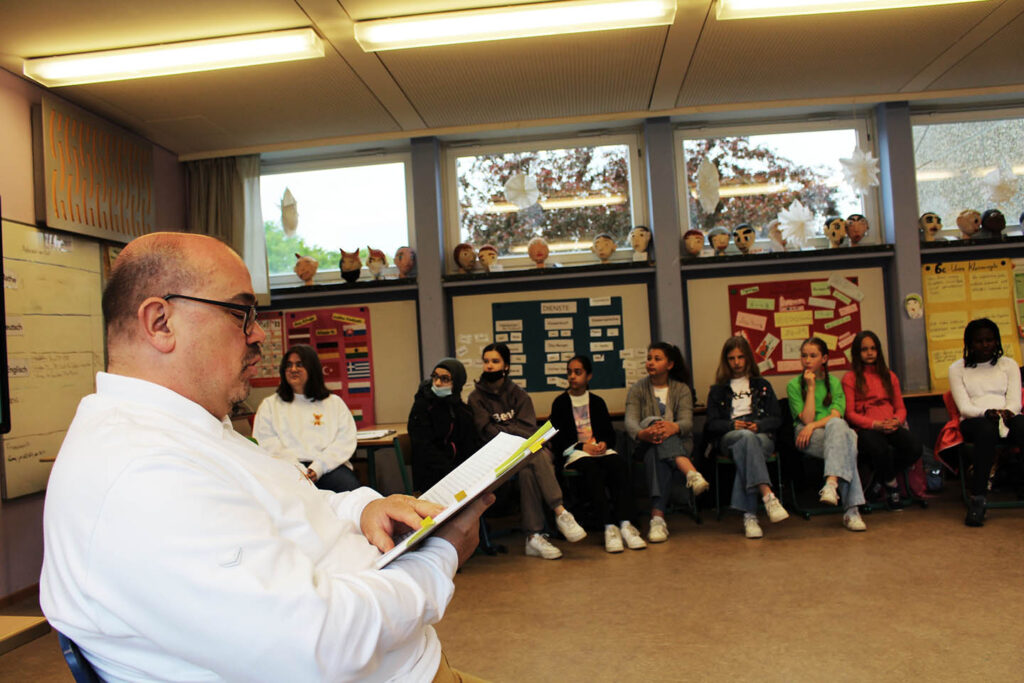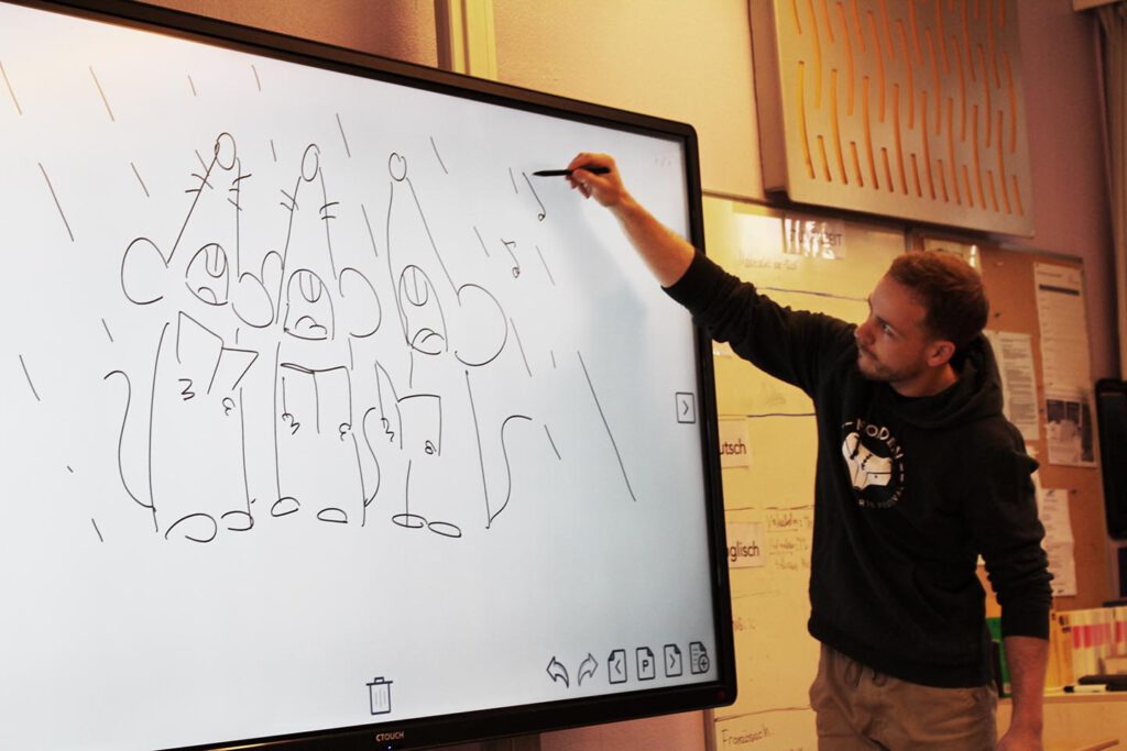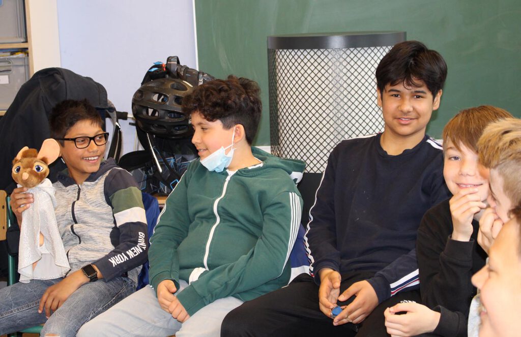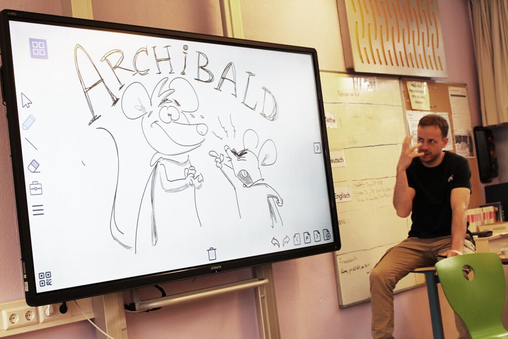 Oh ja, denn heute am Freitag, den 13. Mai besuchte uns, die Klasse 6c, der Autor Onnen Döllefeld in unserem Klassenraum. Und er kam mit prominenter Unterstützung: dem Illustratoren Jerry Drave! Jerry hat nämlich all den Figuren in Onnos Geschichte ihr wundervolles Aussehen verliehen und zeichnete live am Panel, während uns Onno den Haupthelden vorstellt: Archibald, die Schutzengelmaus und seines Zeichens die 13. Maus in dieser Funktion.
