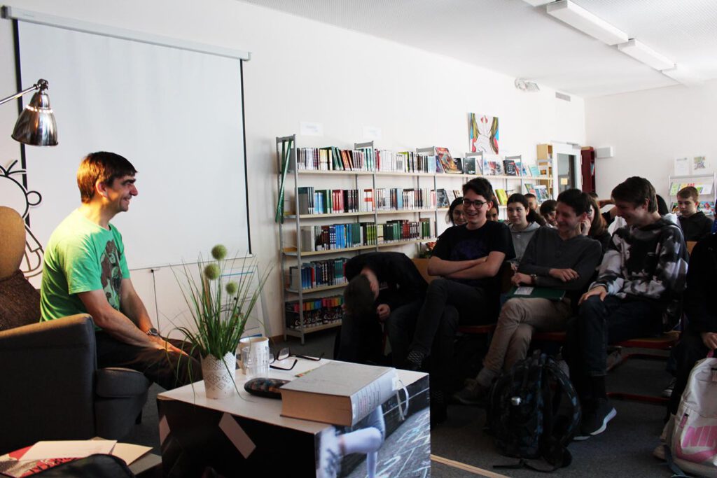 Genau das tat die Klasse 8a von Herrn Sawatzki in diesen frühen Morgenstunden. Sie begab sich ganz in die professionellen Hände des eingeladenen Autoren Alexander Posch, der Schulbibliothekarin Frau Schramm und des Deutschlehrers Herrn Sternberg. Und das Experiment lohnte! Hier konnte man tatsächlich eine ordentliche Ladung Stories tanken und dem Schulalltag entfliehen.