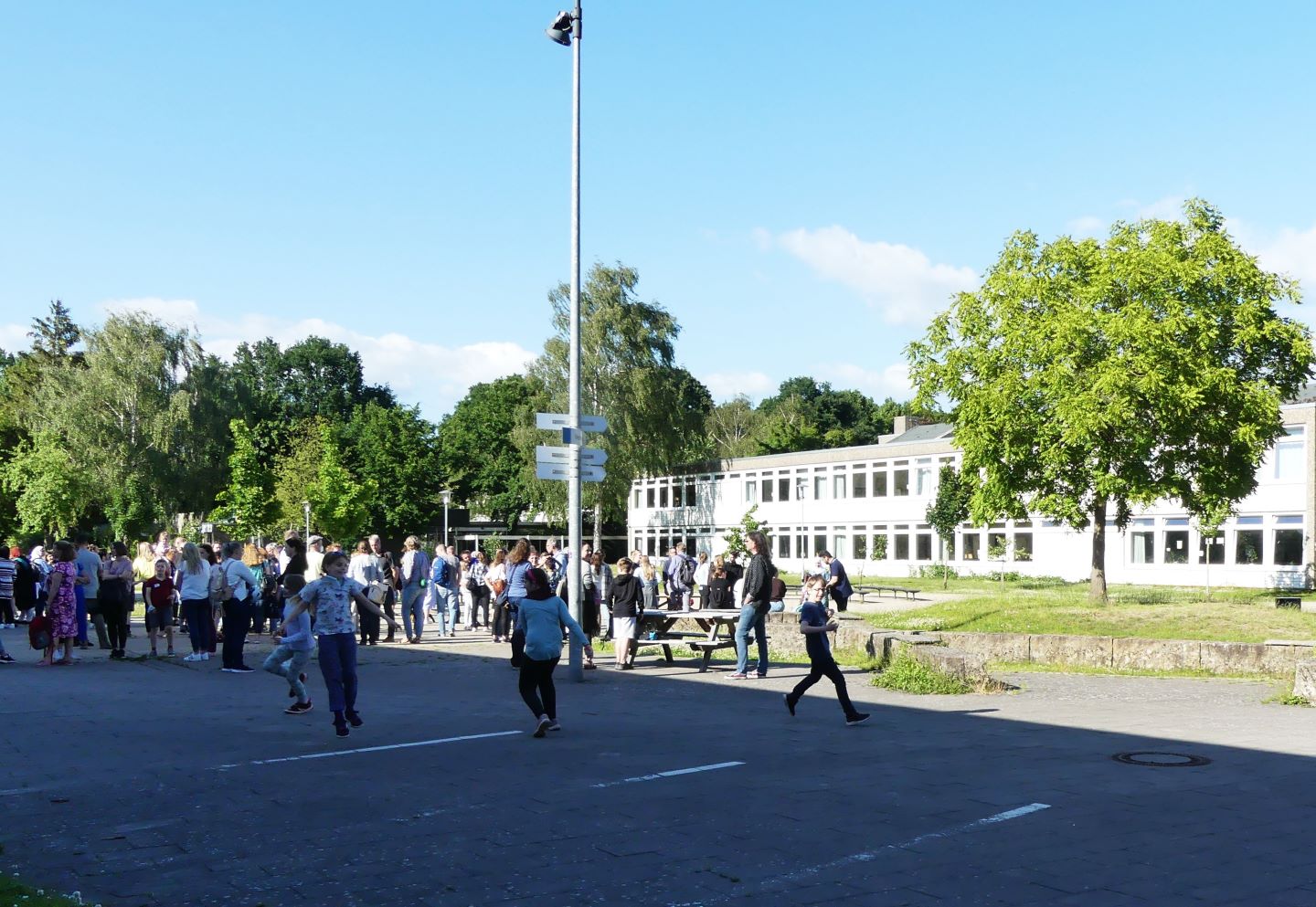 Donnerstag, 16.06.2022, 17:00 Uhr. Bei strahlendem Sonnenschein erscheinen über 100 Familien vor dem Forum des Goethe-Gymnasiums. Sie werden von ihren gut gelaunten Klassenlehrer:innenteams, den Sozialpädagoginnen und den Pat:innen aus Klasse 8 begrüßt. Alle zukünftigen Goethianer:innen erhielten ein Namensschild und dann ging es ins Forum zur Begrüßung. Nach einem warmherzigen Hallo auch aus der Schulleitung durften die Schüler:innen der 4 neuen 5. Klassen schon einmal für eine knappe Stunde das Schulleben am Goethe kennenlernen, während die Eltern und Geschwister noch Informationen zum Übergang und geplanten Aktivitäten des ersten Schuljahres erhielten. Im Anschluss gab es auf dem Schulhof ein Wiedersehen und viele fröhliche Gesichter. So kann der Sommer kommen und die Einschulungsfeier am 22.08.2022 um 9:00 Uhr. Wir freuen uns darauf!