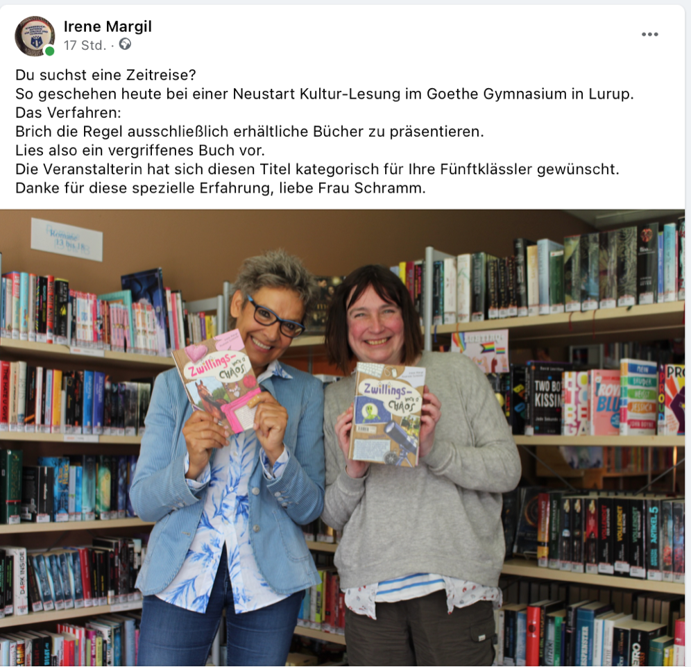 Beim nächsten Termin erwartete uns gleich ein geballtes Doppelpack Literatur- Andreas Schlüter tanzte mit der 6a einen “Walzer in Wien” und Irene Margil vezückte die 5b mit dem “Zwillingschaos hoch 2”. Seht hier den Eintrag auf facebook!