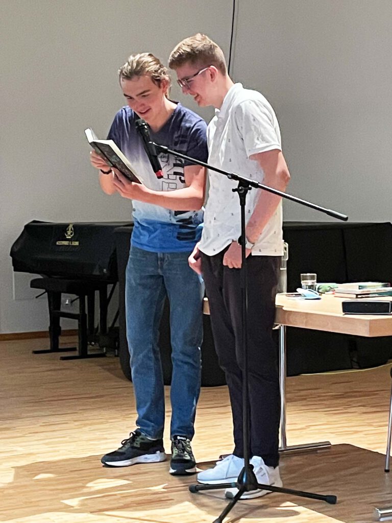 Die beiden Klassen haben auch viele Fragen gestellt, viel auch zu ihrem Leben als Autorin und waren sehr interessiert. Zwei Jungs haben sogar den Dialog im Gestapo-Gefängnis gelesen – siehe Bild. Und auch das ziemlich gut! Schön war’s!!”